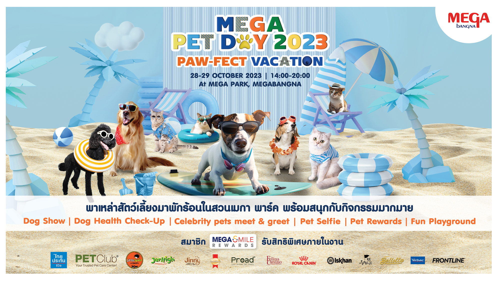 งานนี้ PET LOVERS ห้ามพลาด! ได้เวลาพาน้องหมา-น้องแมวออกมาร่วมสนุกกับงาน MEGA PET DAY 2023 PAW-FECT VACATION ระหว่างวันที่ 28-29 ตุลาคม 2566 ณ เมกาพาร์ค ศูนย์การค้า เมกาบางนา