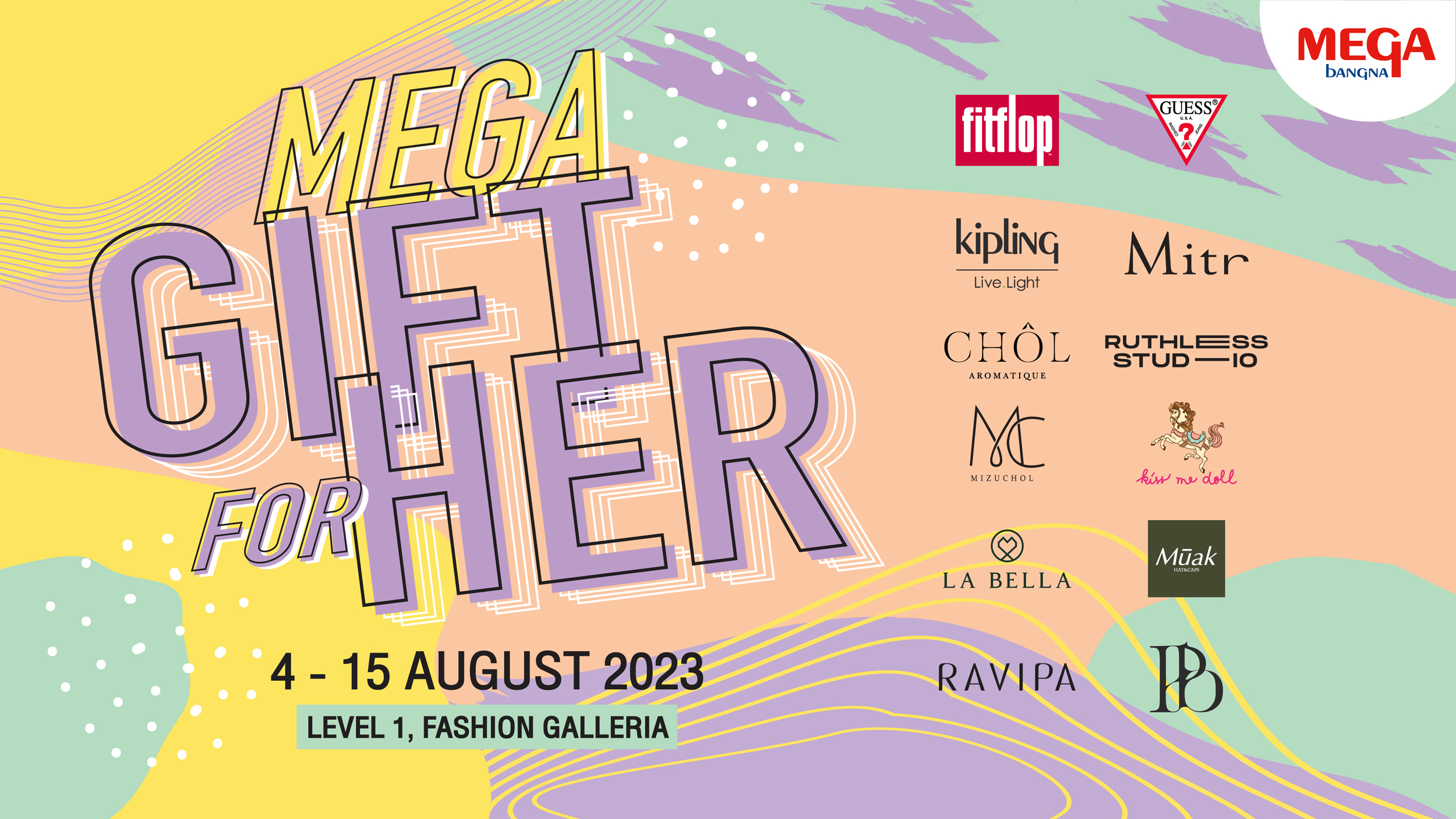 มาร่วมสะท้อนตัวตนความเป็นผู้หญิงเลือกช้อปหลากหลายสินค้าแฟชั่นไอเทมในงาน MEGA GIFT FOR HER ระหว่างวันที่ 4 – 15 สิงหาคม 2566 ณ โซนแฟชั่น แกลอเรีย ชั้น 1 ศูนย์การค้าเมกาบางนา ทุกๆ การใช้จ่ายภายในงานที่มีตราประทับครบ 500 บาทขึ้นไป สามารถนำมาสะสมคะแนนผ่านทางแอปพลิเคชันเมกาบางนา เพื่อรับสิทธิพิเศษต่างๆ โปรแกรมเมกา สไมล์ รีวอร์ดสได้ตลอดทั้งเดือน