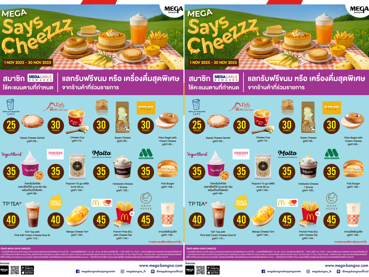 ศูนย์การค้าเมกาบางนา แหล่งช้อปปิ้งที่ใหญ่ที่สุดแห่งกรุงเทพฯ ฝั่งตะวันออก พร้อมเติมเต็มประสบการณ์ชีวิตที่ดีในทุกๆ วัน ด้วยแนวคิด YOUR EVERYDAY MEETING PLACE ชวนเหล่าคนรักชีสมาฟินไปกับความละมุนของเมนูสุดชีสในแคมเปญ “MEGA SAYS CHEEZZZ” ที่รวบรวมเมนูขนมและเครื่องดื่มรสชีสจาก 12 ร้านดังในศูนย์การค้าเมกาบางนา ได้แก่ AU BON PAIN, BEARHOUSE, MCDONALD’S, MEGA CINEPLEX, MILCH, MOLTO, MOS BURGER, SMILEYHOUND CAFÉ, TP TEA, THE VOLCANO, YENLY YOURS และ YOGURTLAND โดยสมาชิกเมกา สไมล์ รีวอร์ดส แลกรับฟรี! ง่ายๆ เพียงใช้คะแนนตามที่กำหนด ตั้งแต่วันที่ 1–30 พฤศจิกายน 2568 ที่ศูนย์การค้าเมกาบางนาเท่านั้น