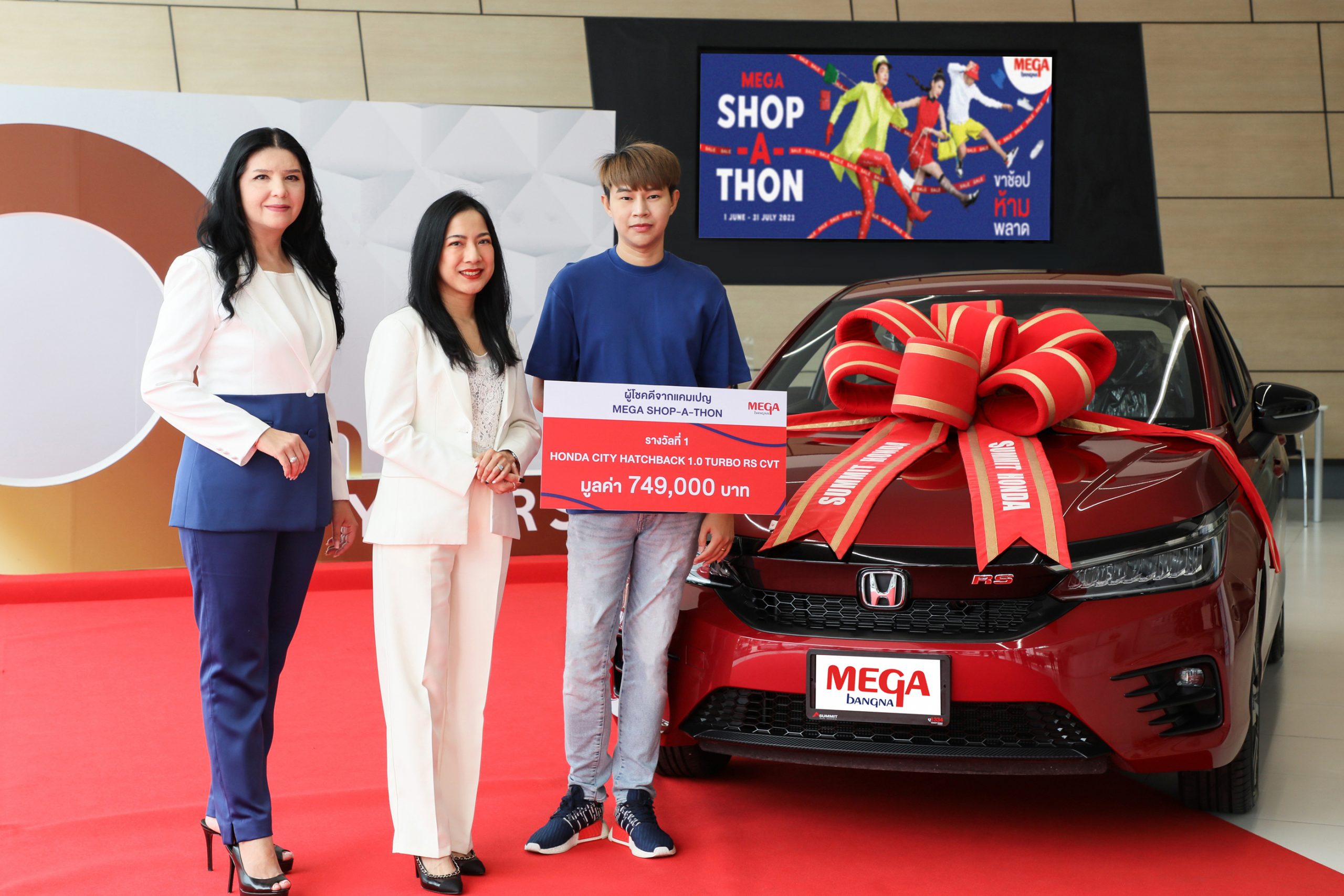 วรรณวิมล อรดีดลเชษฐ์ (กลาง) ผู้อำนวยการฝ่ายการตลาด ศูนย์การค้าเมกาบางนา และ ธีรวรรณ จิวจินดา (ซ้าย) ผู้จัดการทั่วไปฝ่ายขายและการตลาด บริษัท ซัมมิท ฮอนด้า ออโตโมบิล จํากัด มอบรางวัลรถยนต์ HONDA CITY HATCHBACK 1.0 TURBO RS CVT มูลค่า 749,000 บาท ให้แก่ พิชญะ เพ็ชรมณี (ขวา) นักช้อปตัวจริง ผู้โชคดีจากแคมเปญ MEGA SHOP-A-THON ที่จัดเอาใจขาช้อปแบบจัดหนัก จัดเต็มด้วยสิทธิพิเศษสำหรับสมาชิก MEGA SMILE REWARDS พร้อมของรางวัลสำหรับผู้โชคดีจากการเข้าร่วมแคมเปญอีกมากมาย อาทิ บัตรกำนัลแทนเงินสด (GIFT VOUCHER) มูลค่ารวม 50,000 บาท จำนวน 10 รางวัล, จี้เพชรน้ำ 99 พร้อมสร้อยคอ จาก JUBILEE DIAMOND มูลค่า 36,000 บาท จำนวน 4 รางวัล และของรางวัลอื่นๆ รวมมูลค่ารางวัลตลอดการจัดรายการกว่า 2.4 ล้านบาท ณ โชว์รูมและศูนย์บริการซัมมิท ฮอนด้า สาขาบางนา กม. 4.5