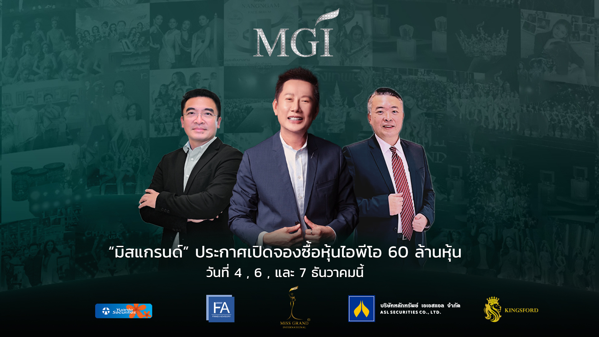 ด้านที่ปรึกษาทางการเงิน “คุณวรชาติ ทวยเจริญ” กรรมการผู้จัดการ บริษัท ฟินเน็กซ์ แอ๊ดไวเซอรี่ จำกัด เผยว่า MGI มีโครงสร้างรายได้ธุรกิจที่แข็งแกร่ง พิสูจน์ด้วยผลงานทั้งรายได้และกำไรที่เติบโตต่อเนื่อง ย้ำ เป็นบริษัทแรกที่นำเวทีนางงามเข้าสู่มหาชน ครบเครื่องทั้งธุรกิจพาณิชย์ – การจัดประกวดนางงาม – ธุรกิจสื่อและบันเทิง – ธุรกิจบริหารจัดการศิลปิน โมเดลแบบนี้ บอกเลย ไม่เหมือนใครในโลก ! และ “คุณธวัทชัย แพร่แสงเอี่ยม” ประธานเจ้าหน้าที่บริหาร บริษัทหลักทรัพย์ เอเอสแอล จำกัด ในฐานะผู้จัดการการจัดจำหน่าย ย้ำอีกครั้ง นักลงทุนทุกท่านจองซื้อหุ้นเพิ่มทุนนี้ได้ ผ่าน บริษัทหลักทรัพย์ 3 แห่งคือ บริษัทหลักทรัพย์ เอเอสแอล จำกัด, บริษัทหลักทรัพย์ หยวนต้า (ประเทศไทย) จำกัด และ บริษัทหลักทรัพย์ คิงส์ฟอร์ด จำกัด