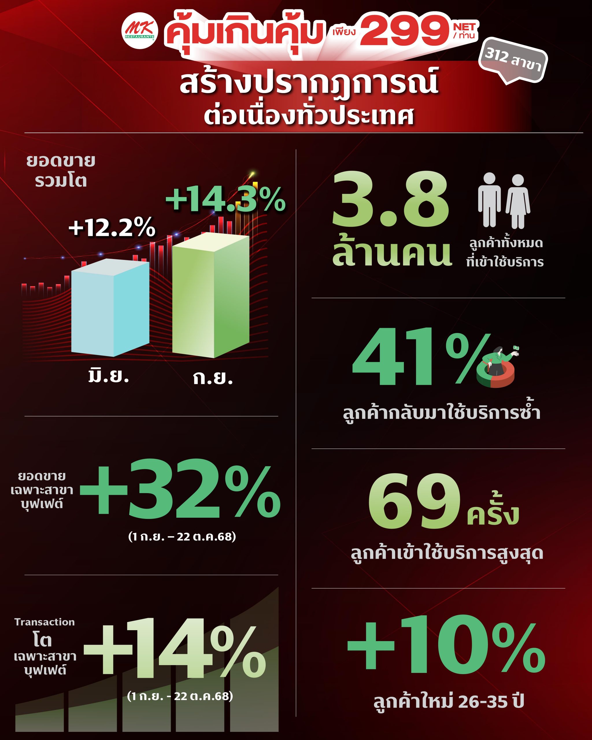 MK คุ้มเกินคุ้ม 299 บาท สร้างปรากฏการณ์ความสนใจต่อเนื่องทั่วประเทศ กว่า 312 สาขา ตั้งแต่ คุ้มคุ้ม อิ่มไม่อั้น (เวอร์ชั่น 1) เดือนมิถุนายน ทำให้ยอดขายรวมเติบโต 12.2% และ คุ้มเกินคุ้ม (เวอร์ชั่น 2) เดือนกันยายน โตขึ้นอีก โดยมียอดขายรวมเติบโต 14.3% แม้จะเปิดให้บริการมายาวนานหลายเดือน แต่ยังคงสามารถรักษาตำแหน่งครองใจลูกค้า ทำให้ปัจจุบันมีลูกค้ากลับมาใช้บริการซ้ำสูงถึง 41% และมากสุดถึง 69 ครั้ง นอกจากนี้ยังสร้างเสียงเชิงบวกบนโซเชียลอย่างมากมาย จากทั้งฐานลูกค้าเดิมและลูกค้าใหม่