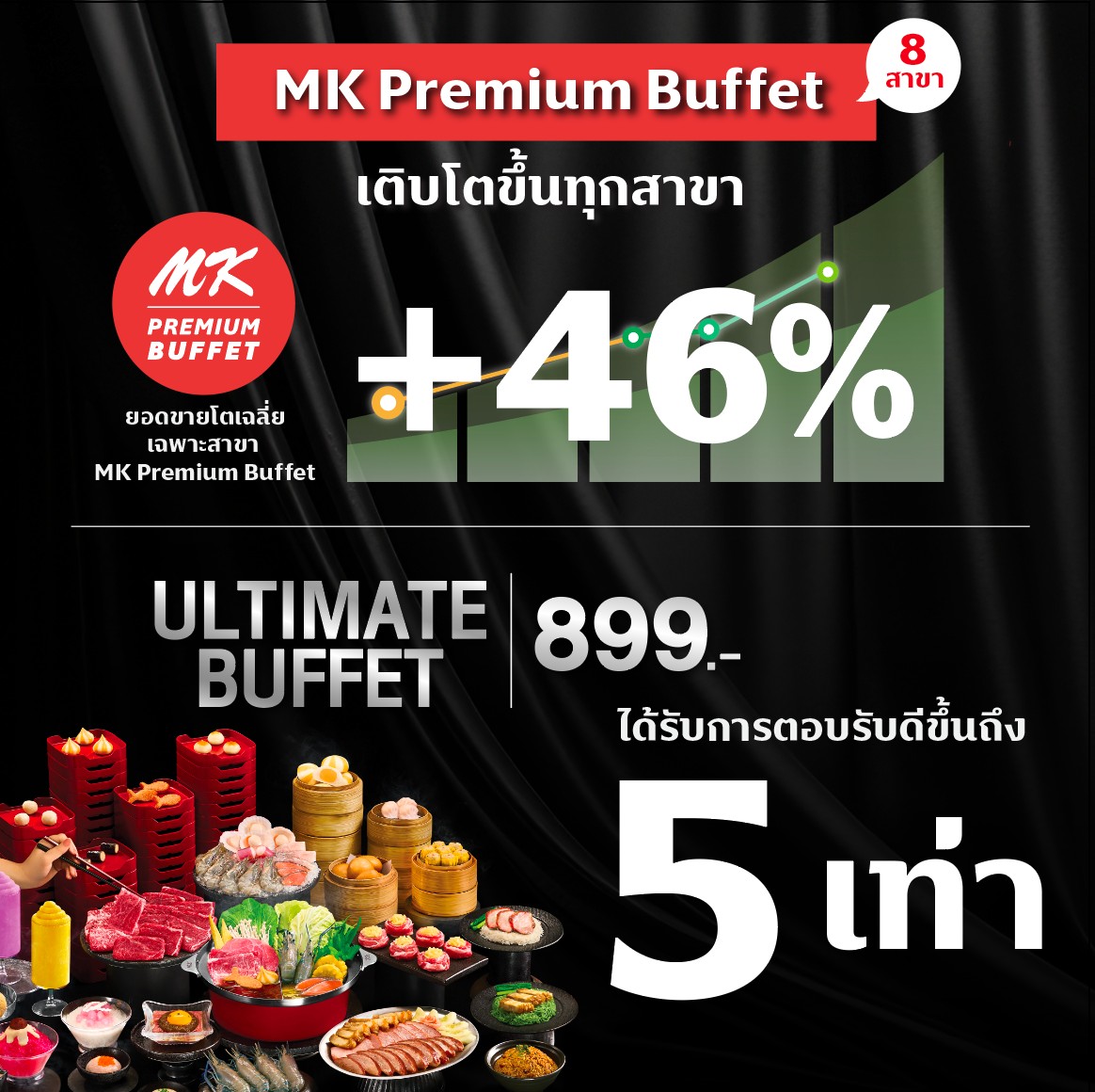 MK Premium Buffet เปิดให้บริการเมื่อเดือนกันยายน รวม 8 สาขา โดยมีปรับเมนูใหม่ให้สมกับการรอคอย ตามเสียงเรียกร้องบนโซเชียล พร้อมจัดเต็มทั้งรสชาติ, คุณภาพ รวมถึงการให้บริการที่สร้างความประทับใจให้ลูกค้า และยังตอบโจทย์ทุกความชอบ ด้วยราคาที่เข้าถึงง่าย ส่งผลให้ยอดขายเฉพาะสาขา Premium Buffet เติบโตเฉลี่ย 46% เมื่อเทียบกับช่วงเดียวกันของปีก่อน