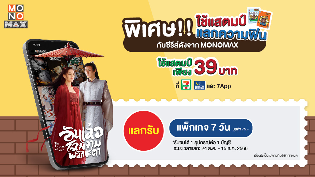 “MONOMAX” (โมโนแมกซ์) ร่วมกับ บริษัท เคาน์เตอร์เซอร์วิส จำกัด มอบสิทธิพิเศษสำหรับคนที่ชื่นชอบดูหนังและซีรีส์ สามารถใช้แสตมป์7-Eleven แลกรับรหัสเติมวันใช้งาน ดูหนังและซีรีส์ ที่ MONOMAX ได้ 7 วัน ในราคา 39 บาท โดยสามารถแลกแสตมป์ ผ่านแอปพลิเคชัน 7App และ เคาน์เตอร์เซอร์วิสในร้าน 7-Eleven ได้ทุกสาขา ตั้งแต่วันนี้ – 15 ธันวาคม 2566 และสามารถรับชมได้ถึง วันที่ 30 เมษายน 2567