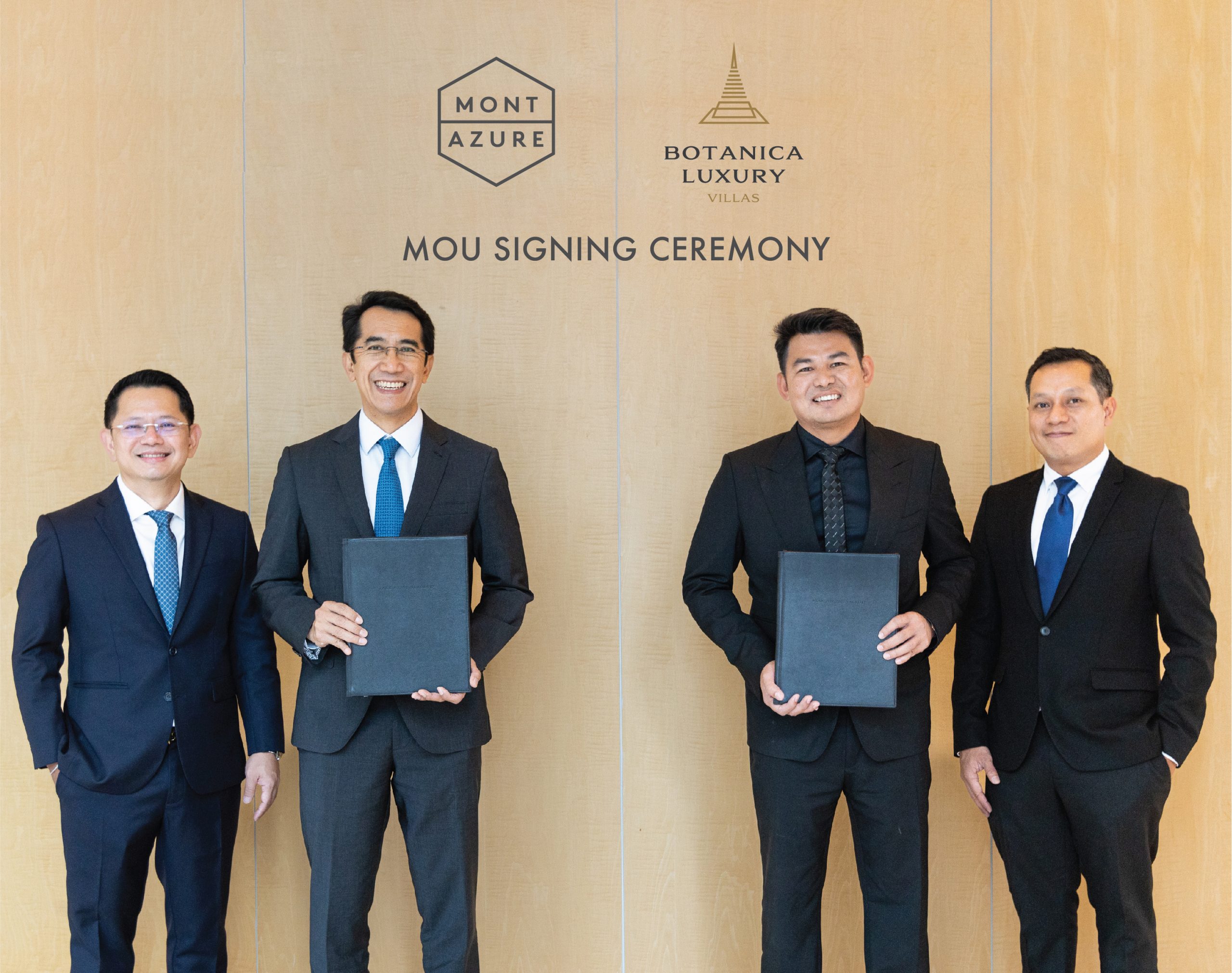 มอนท์เอซัวร์ ภูเก็ต อาณาจักรมิกซ์ยูสซูเปอร์ไฮเอนด์บนทำเลสุดพิเศษของเกาะภูเก็ต “หาดกมลา” นำโดย มร. โจนาธาน อูมาลิ (ที่ 2 จากซ้าย) กรรมการบริหาร มอนท์เอซัวร์ และนายเศรษฐพล บุตรโท (ซ้าย) กรรมการบริหาร มอนท์เอซัวร์ ลงนามบันทึกความร่วมมือ (MOU) กับโบทานิก้า ลักซูรี่ วิลล่า (Botanica Luxury Villas) นำโดย นายอรรถสิทธิ์ อินทรชูติ (ที่ 3 จากซ้าย) ประธานกรรมการบริหาร บริษัท โบทานิก้า ลักซูรี่ ภูเก็ต จำกัด พร้อมด้วยนายอาชีพ ธำรงธนยศ (ที่ 4 จากซ้าย) ผู้จัดการทั่วไป บริษัท โบทานิก้า ลักซูรี่ ภูเก็ต จำกัด เตรียมร่วมพัฒนาโครงการวิลล่าหรูระดับลักชัวรีวิวทะเลภายในโครงการมอนท์เอซัวร์ ครอบคลุมพื้นที่บริเวณเชิงเขากมลา ห่างจากชายหาดเพียง 400 เมตร มูลค่าโครงการกว่า 2,600 ล้านบาท เตรียมเปิดตัวเต็มรูปแบบภายในเดือนกันยายน 2566 นี้ โดยมีราคาเริ่มต้นที่ 49 ล้านบาทไปจนถึงกว่า 170 ล้านบาท เพื่อตอบสนองความต้องการวิลล่าหรูในภูเก็ตจากกำลังซื้อในตลาดไฮเอนด์ที่กำลังมาแรงจากทั้งชาวไทยและต่างชาติ
