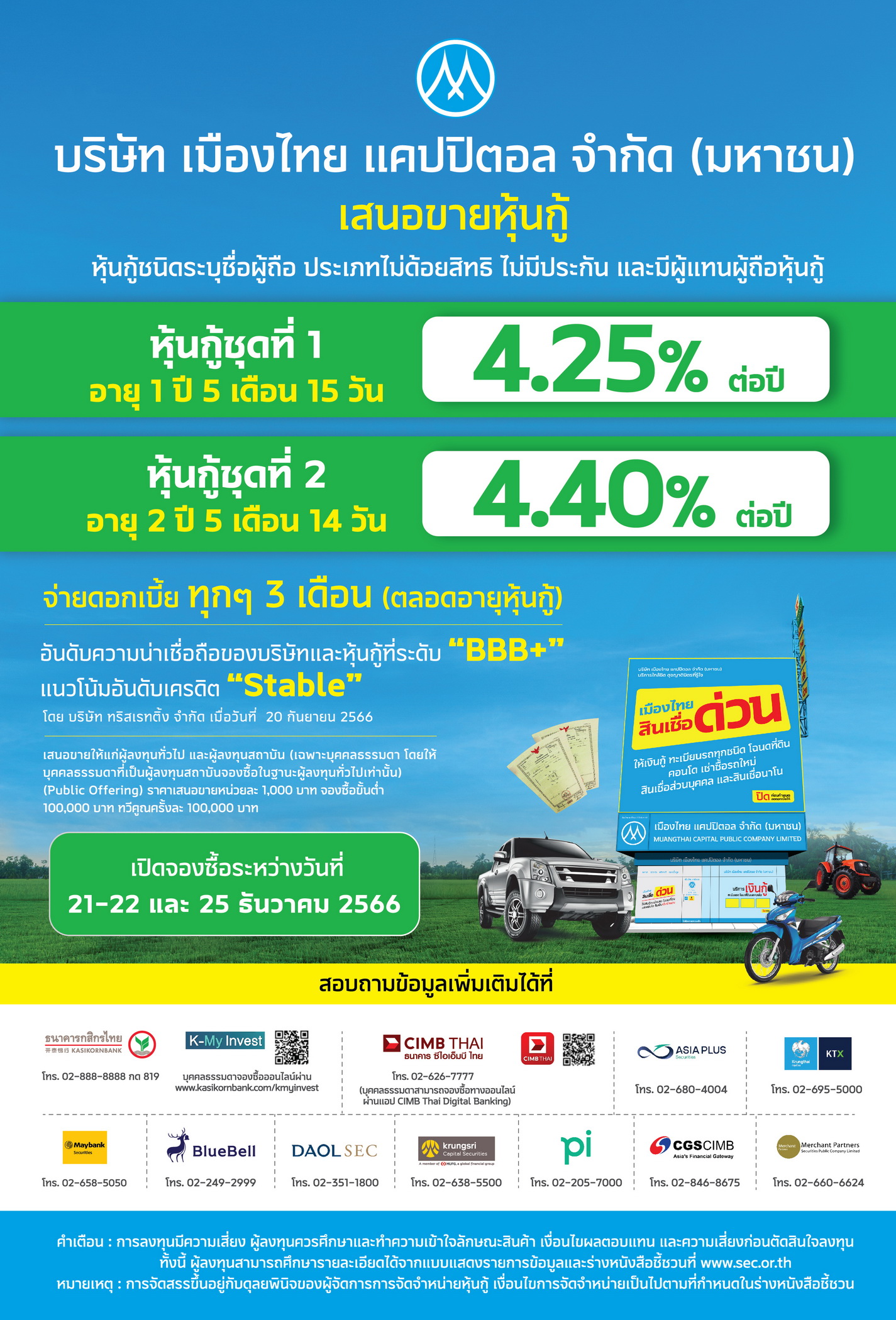 นายปริทัศน์ เพชรอำไพ รองกรรมการผู้จัดการ บริษัท เมืองไทย แคปปิตอล จำกัด (มหาชน) (MTC) เปิดเผยว่า บริษัทฯ เตรียมเสนอขายหุ้นกู้ชุดใหม่ จำนวน 2 ชุด ให้แก่ผู้ลงทุนทั่วไป และผู้ลงทุนสถาบัน (เฉพาะบุคคลธรรมดา โดยให้บุคคลธรรมดาที่เป็นผู้ลงทุนสถาบันจองซื้อทั่วไปเท่านั้น) โดยเสนอขายระหว่างวันที่ 21-22 และ 25 ธันวาคม 2566 ผ่านสถาบันการเงินชั้นนำ 11 แห่ง โดยวัตถุประสงค์ในการออกหุ้นกู้ครั้งนี้ บริษัทฯ จะนำเงินที่ได้ไปใช้เป็นเงินทุนหมุนเวียนเพื่อขยายกิจการของบริษัทฯ