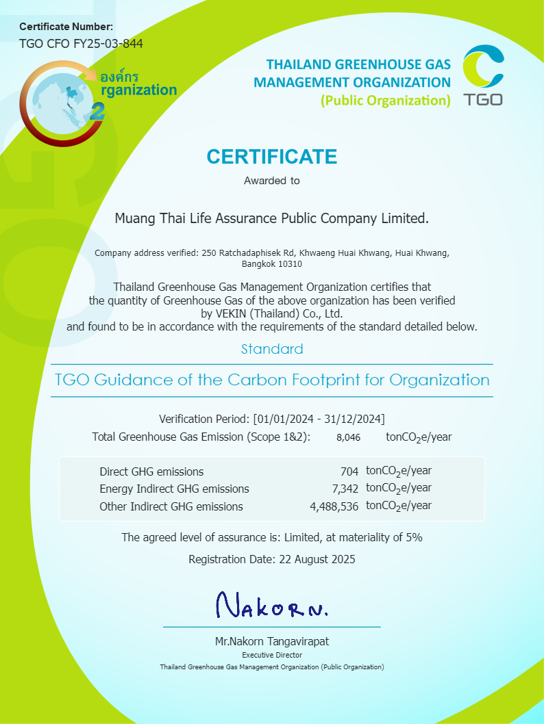 บริษัท เมืองไทยประกันชีวิต จำกัด (มหาชน) ยืนยันความมุ่งมั่นสู่ความยั่งยืนด้วยการขึ้นทะเบียน คาร์บอนฟุตพริ้นท์ขององค์กร (Carbon Footprint for Organization: CFO) กับ องค์การบริหารจัดการก๊าซเรือนกระจก (องค์การมหาชน) หรือ อบก. อย่างต่อเนื่องเป็นปีที่ 3 โดยครอบคลุมการประเมินการปล่อยก๊าซเรือนกระจกใน Scope 1, Scope 2 และ Scope 3 อ้างอิงข้อมูลจาก ปีฐาน พ.ศ. 2565