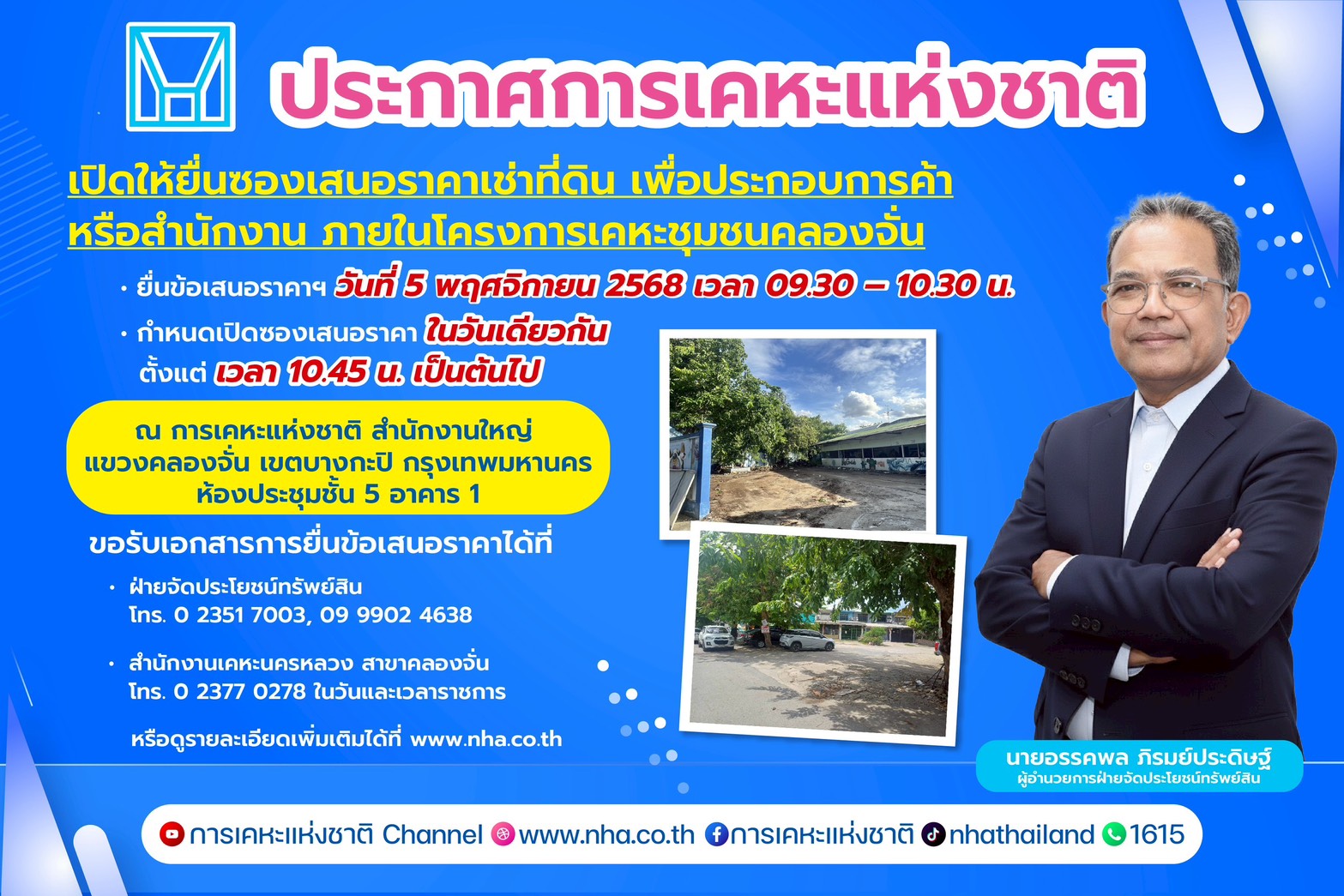 นายอรรคพล ภิรมย์ประดิษฐ์ ผู้อำนวยการฝ่ายจัดประโยชน์ทรัพย์สิน กล่าวว่าการเคหะแห่งชาติเปิดให้เอกชนยื่นซองเสนอราคาค่าธรรมเนียมการได้สิทธิเช่าที่ดิน เพื่อประกอบการค้า หรือสำนักงาน ภายในโครงการเคหะชุมชนคลองจั่น ตั้งอยู่ที่บริเวณซอยนวมินทร์ 49 ถนนนวมินทร์ แขวงคลองจั่น เขตบางกะปิ กรุงเทพฯ ของโฉนดที่ดินเลขที่ 249094 ขนาดเนื้อที่ประมาณ 0-2-40.4 ไร่ และโฉนดที่ดินเลขที่ 249172 ขนาดเนื้อที่ประมาณ 0-1-73.7 ไร่ เนื้อที่เช่ารวม 1-0-14.1 ไร่ เพื่อให้เกิดความโปร่งใสในการดำเนินงานทุกขั้นตอนตามหลักธรรมาภิบาล การเคหะแห่งชาติจึงเปิดโอกาสให้เอกชนที่สนใจสามารถยื่นข้อเสนอราคาการได้สิทธิเช่าที่ดินดังกล่าว โดยมีอัตราค่าธรรมเนียมการได้สิทธิเช่าขั้นต่ำไม่น้อยกว่า 690,000 บาท ระยะเวลาการให้สิทธิเช่า 6 ปี (ทำสัญญาคราวเดียว) ปลอดค่าเช่า 3 เดือน ในอัตราค่าเช่ารายเดือน ปีที่ 1-3 เดือนละ 63,000 บาท ปีที่ 4-6 เดือนละ 73,000 บาท กำหนดหลักประกันการยื่นซองเสนอราคาจำนวน 138,000 บาท กำหนดเงินประกันการปฏิบัติตามสัญญา เป็นเงิน 219,000 บาท โดยกำหนดวันยื่นข้อเสนอราคาฯ ในวันที่ 5 พฤศจิกายน 2568 เวลา 09.30–10.30 น. และกำหนดเปิดซองเสนอราคาในวันเดียวกัน ตั้งแต่เวลา 10.45 น. เป็นต้นไป ณ ห้องประชุมชั้น 5 อาคาร 1 สำนักงานใหญ่ การเคหะแห่งชาติ แขวงคลองจั่น เขตบางกะปิ กรุงเทพมหานคร