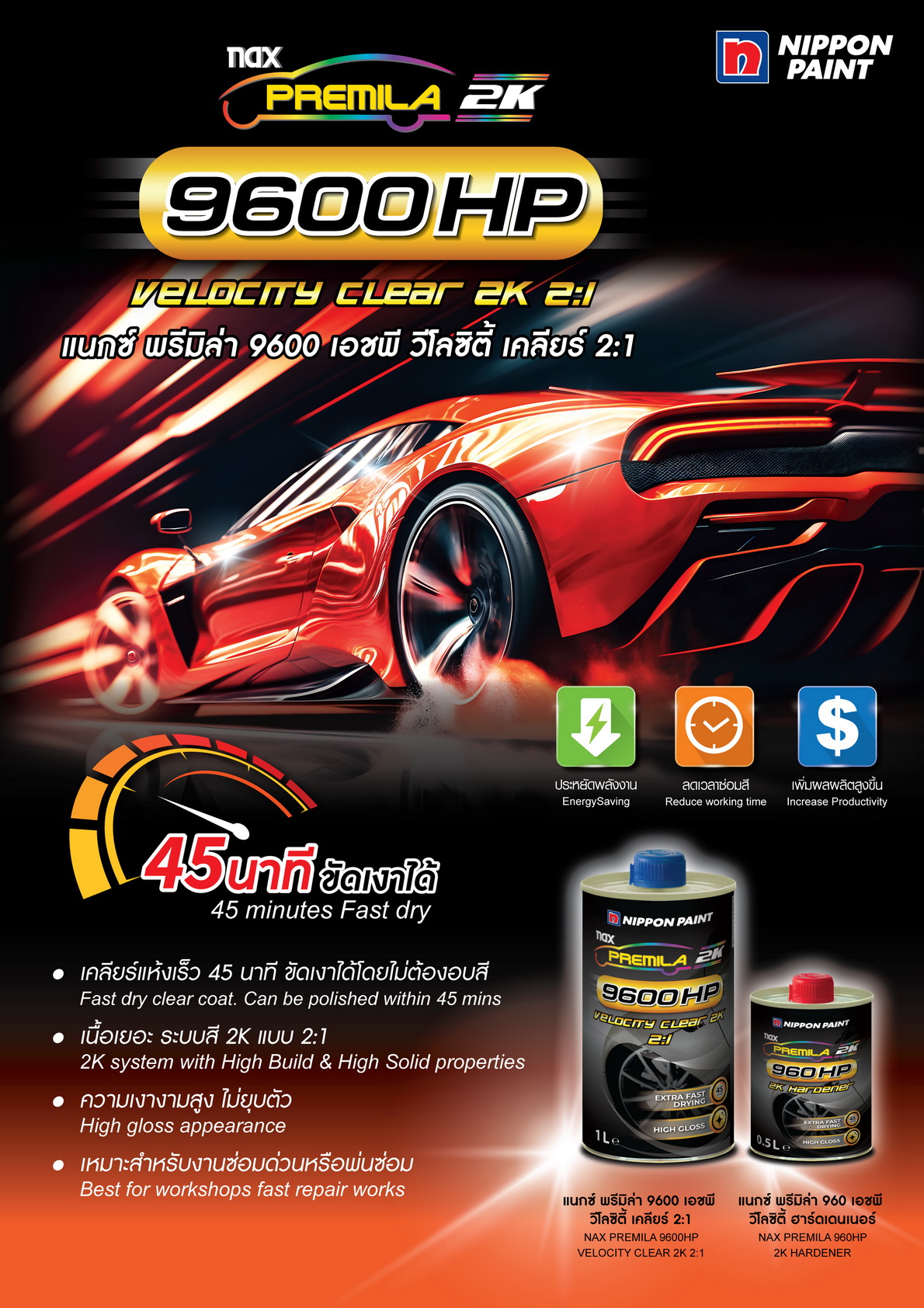 ไม่ปล่อยให้รอนาน …. บริษัท นิปปอนเพนต์ (ประเทศไทย) จำกัด ธุรกิจสีพ่นซ่อมรถยนต์ ออกสินค้า Nax Premila 9600 HP Velocity Clear 2K 2:1 “แนกซ์ พรีมิล่า 9600 เอชพี วีโลซิตี้ เคลียร์ ทูเค 2ต่อ1 รุ่นใหม่ล่าสุด ! ซ่อมเร็ว เสร็จไว ที่สุดแห่งเคลียร์แห้งเร็ว แห้งเร็ว กว่าระบบเคลียร์ทั่วไปแบบเดิมๆ ถึง 8 เท่า แต่ยังคงความเงา ฉ่ำ ลึก เช่นเดิมด้วยประสิทธิ์ภาพ”เคลียร์แห้งเร็ว 45 นาที ขัดเงาได้โดยไม่ต้องอบสี”