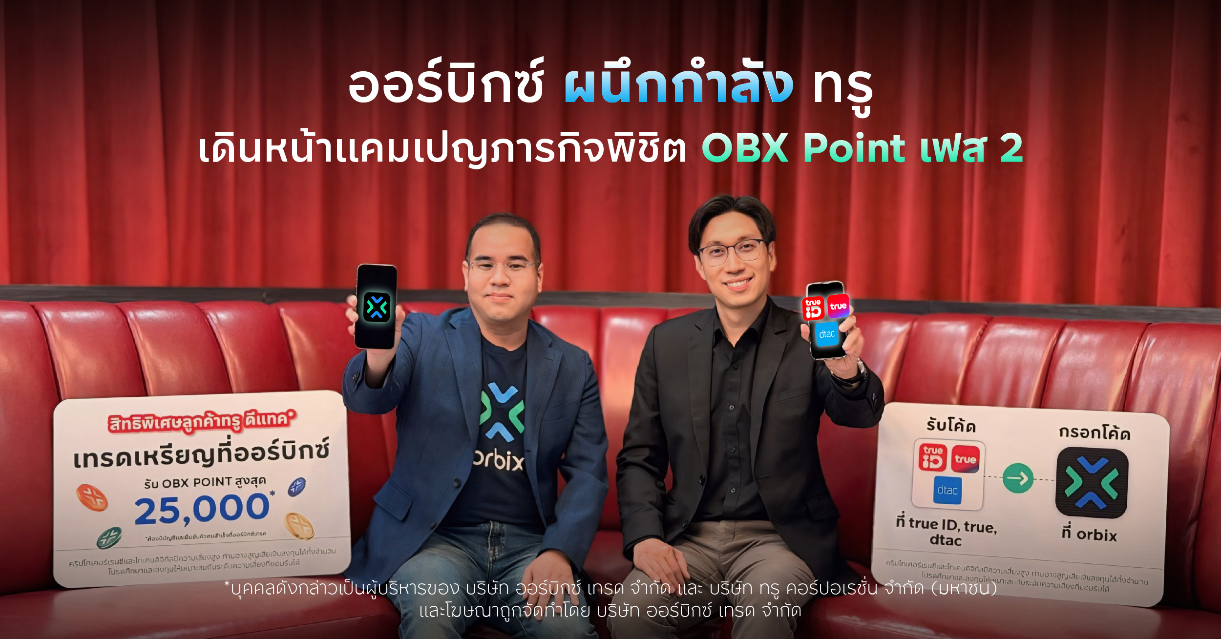 นายธนเดช ช่วงแก้ววิเศษ หัวหน้าฝ่ายการตลาด บริษัท ออร์บิกซ์ เทรด จำกัด เปิดเผยว่า ความร่วมมือระหว่าง ออร์บิกซ์ กับ ทรู คอร์ปอเรชั่น ในครั้งนี้ ถือเป็นแคมเปญเฟสที่ 2 ของการสร้างประสบการณ์เชื่อมโยงโลกการเงินดิจิทัลกับไลฟ์สไตล์ของผู้บริโภคยุคใหม่ และเป็นการขอบคุณลูกค้าสำหรับความไว้วางใจอย่างต่อเนื่องในความมุ่งมั่นพัฒนาโปรแกรมสะสมคะแนน OBX Point ให้เป็น Loyalty Program เพื่อช่วยให้ผู้ใช้งานเริ่มต้นลงทุนในสินทรัพย์ดิจิทัลได้ง่ายขึ้น และช่วยเพิ่มความคุ้มค่าให้แก่นักลงทุนในทุกระดับ สอดคล้องกับกลยุทธ์ Power Up Your Life ที่มุ่งยกระดับประสบการณ์การลงทุนในสินทรัพย์ดิจิทัลให้เข้าถึงได้ โดยลูกค้าทรู-ดีแทคที่มีบัญชี และทำรายการเทรดบนแพลตฟอร์มออร์บิกซ์ สามารถรับคะแนนสะสม OBX Point สูงสุด 25,000 คะแนน (OBX Point 10,000 คะแนน มีมูลค่า 100 บาท) และนำไปแลกรับของรางวัลหรือสิทธิพิเศษต่าง ๆ อาทิ บัตรกำนัลเครื่องดื่ม ร้านอาหาร บัตรของขวัญสำหรับห้างสรรพสินค้าและร้านค้าชั้นนำ