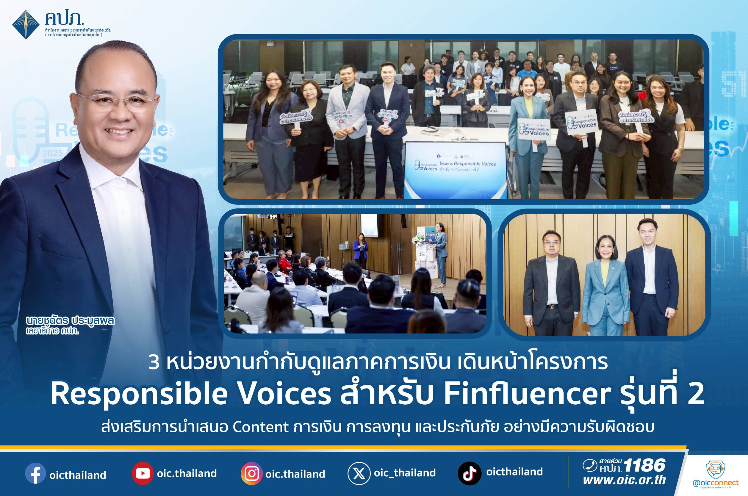 โครงการ Responsible Voices สำหรับ Finfluencer รุ่นที่ 2 จัดขึ้นภายใต้การร่วมมือของทั้ง 3 หน่วยงานกำกับดูแล โดยมีเป้าหมายเพื่อส่งเสริมให้ Financial Influencer (Finfluencer) จากภาคการเงิน การลงทุน และประกันภัย มีความรู้ความเข้าใจ และสามารถเผยแพร่ข้อมูลให้แก่ผู้ติดตามได้อย่างถูกต้องและเหมาะสม ยกระดับสู่การเป็น Finfluencer ที่นำเสนอข้อมูลอย่างมี ความรับผิดชอบ และคำนึงถึงผลกระทบที่อาจจะเกิดขึ้นต่อผู้ติดตามและสังคม รวมทั้งขยายผลสู่การสร้างความตระหนักต่อผู้ประกอบธุรกิจที่มีการสื่อสารผ่าน Finfluencer ซึ่งจากความสำเร็จในรุ่นที่ 1 กลุ่ม Finfluencer ได้ระดมความคิดเห็นอย่างสร้างสรรค์ และร่วมกันจัดทำเนื้อหาด้านการเงิน การลงทุน และประกันภัยในรูปแบบต่าง ๆ เพื่อเผยแพร่ผ่านช่องทางโซเชียลมีเดีย โดยผู้ที่ผ่านการเข้าร่วมโครงการฯ ในรุ่นที่ 1 มีผู้ติดตาม (followers) จำนวนรวมมากกว่า 14 ล้านคน ซึ่งสะท้อนถึงพลังของการสื่อสารและสร้างการเปลี่ยนแปลงให้ Finfluencer ให้ตระหนักถึงบทบาทของตนเองในการให้ข้อมูลอย่างมีความรับผิดชอบ และมีการช่วยเหลือกันภายในเครือข่าย เพื่อส่งเสริมให้เกิดสังคมการให้ข้อมูลที่มีความรับผิดชอบ พร้อมทั้งร่วมเป็นส่วนหนึ่งของผู้ที่กระจายข้อมูลข่าวสารที่เป็นประโยชน์จากหน่วยงานกำกับดูแลทั้ง 3 แห่ง ไปสู่ประชาชนในวงกว้าง จึงเป็นที่มาของการดำเนินการต่อเนื่องในรุ่นที่ 2 โดยยังคงยึดเป้าหมายในการส่งเสริมการสื่อสารด้วยเสียงที่สร้างสรรค์และมีความรับผิดชอบ เพื่อเสริมสร้างกลไกการคุ้มครองผู้ลงทุนและประชาชนให้เกิดขึ้นได้อย่างยั่งยืน