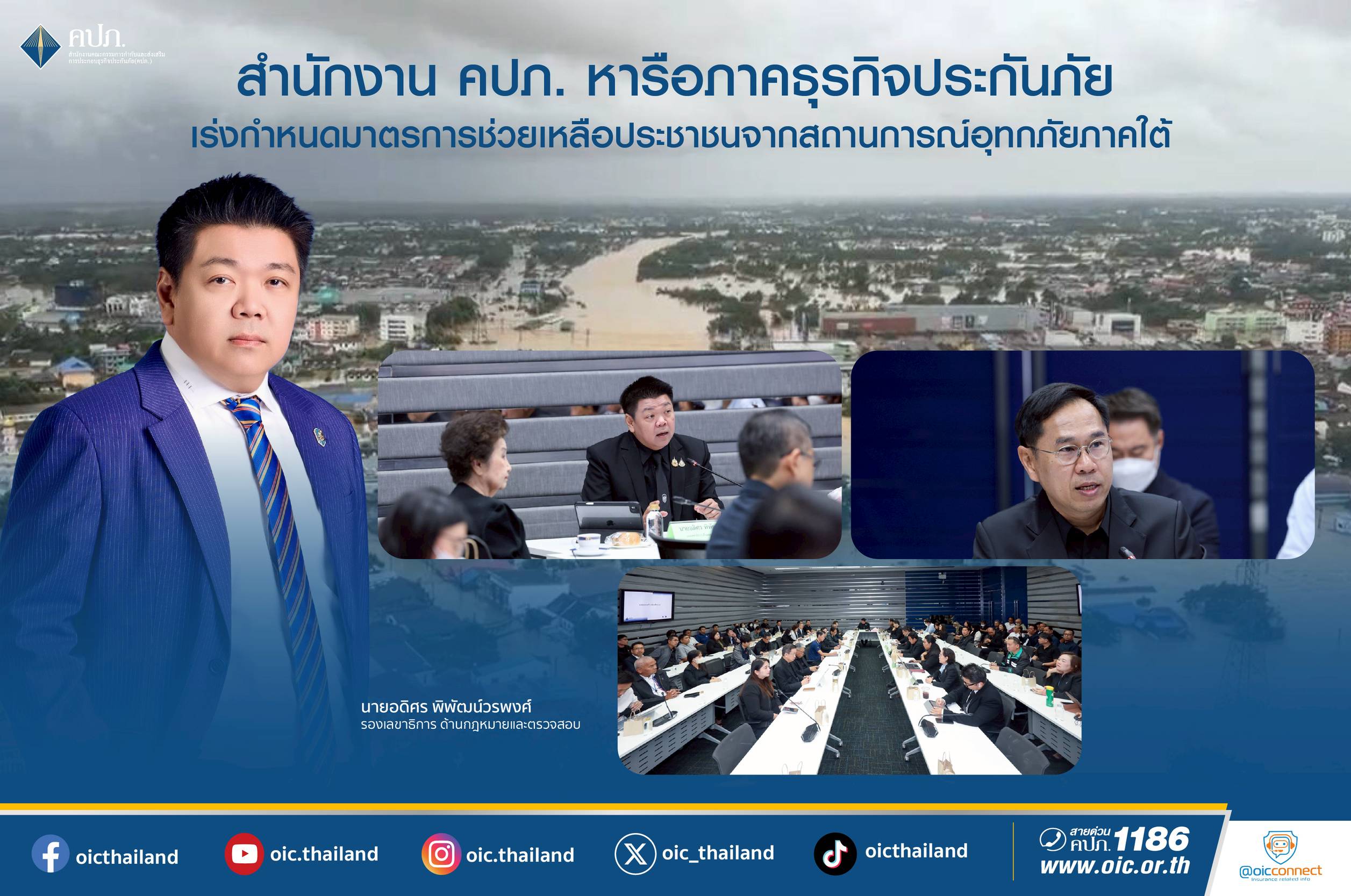 นายชูฉัตร ประมูลผล เลขาธิการคณะกรรมการกำกับและส่งเสริมการประกอบธุรกิจประกันภัย (คปภ.) มอบหมายให้นายอดิศร พิพัฒน์วรพงศ์ รองเลขาธิการ ด้านกฎหมายและตรวจสอบ เป็นประธานการประชุม โดยมีนายคณานุสรณ์ เที่ยงตระกูล ผู้ช่วยเลขาธิการ สายคุ้มครองสิทธิประโยชน์ พร้อมผู้แทนจากภาคธุรกิจประกันภัย และหน่วยงานที่เกี่ยวข้องเข้าร่วมประชุม เพื่อ“กำหนดมาตรการช่วยเหลือประชาชนจากสถานการณ์อุทกภัยภาคใต้” ณ ห้องประชุมสถาบันวิทยาการประกันภัยระดับสูง ชั้น 2 สำนักงาน คปภ. ถนนรัชดาภิเษก