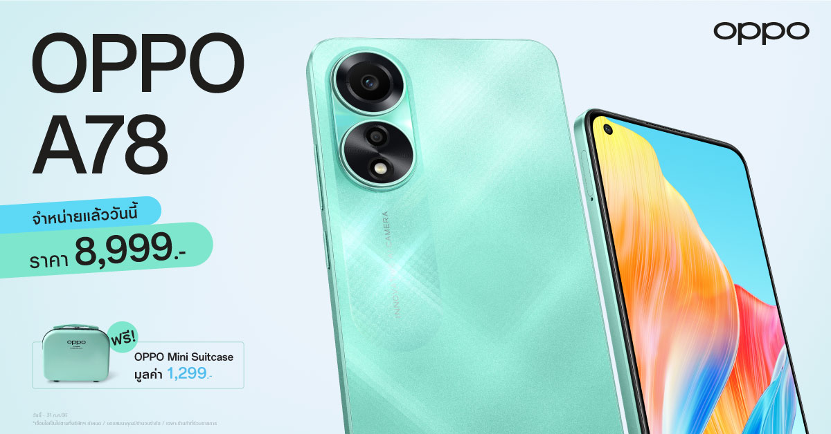 ออปโป้ ไทยแลนด์ วางจำหน่าย “OPPO A78” สมาร์ตโฟนรุ่นล่าสุดจาก OPPO A Series อย่างเป็นทางการในประเทศไทย มอบประสบการณ์ใช้งานที่เร็วแรงสุดทุกเอ็นเตอร์เทน ไม่ว่าจะดูหนัง ฟังเพลงหรือเล่นเกมก็ใช้ได้ยาวๆ ไม่มีสะดุดด้วยชาร์จไว 67W SUPERVOOC ชาร์จเต็มใน 45 นาที พร้อมแบตเตอรี่ใหญ่ 5,000mAh หน่วยความจำจุใจ RAM 8GB + ROM 256GB เพิ่มได้อีก 8GB ดื่มด่ำกับความบันเทิงได้เต็มทุกอรรถรส ซึ่งเป็นครั้งแรกในสมาร์ตโฟนช่วงราคานี้ที่มาพร้อมกับหน้าจอสวย AMOLED คมชัดแบบ FHD+ พร้อมด้วยลำโพงสเตอริโอคู่ และยังมีโหมด Ultra Volume เพิ่มระดับเสียงถึง 200% ดูหนัง ดูซีรีส์หรือเล่นเกมก็ไปสุดทุกความสนุก ถ่ายภาพสวยด้วยกล้องหลัก 50MP สายคอนเทนต์ต้องถูกใจ ด้วย Dual – View Video ถ่ายวิดีโอพร้อมกันทั้งกล้องหน้าและกล้องหลัง มอบคอนเทนต์สุดปัง!