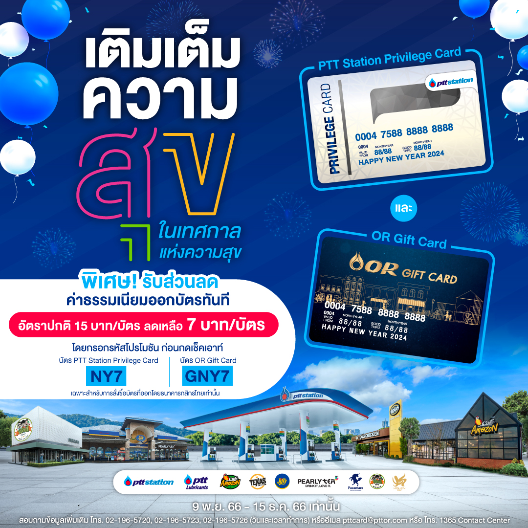 พีทีที สเตชั่น เติมเต็มทุกความสุข ต้อนรับเทศกาลแห่งการเฉลิมฉลองรับปีใหม่ 2567 ด้วยบัตร PTT Station Privilege Card และ OR Gift Card พิเศษ!! เมื่อสั่งซื้อบัตร PTT Station Privilege Card หรือ OR Gift Card วันนี้ รับส่วนลดค่าธรรมเนียมออกบัตรทันที สำหรับบัตร OR Gift Card มูลค่าตั้งแต่ 300 – 1,900 บาทต่อบัตร เพียงกรอกโค้ด GNY7 และบัตร PTT Station Privilege Card มูลค่าตั้งแต่ 500 – 1,900 บาทต่อบัตร เพียงกรอกโค้ด NY7 ก็ได้รับส่วนลดค่าธรรมเนียมการออกบัตรจากอัตราปกติ 15 บาทต่อบัตร ลดเหลือเพียง 7 บาทต่อบัตร และเมื่อสั่งซื้อในนามนิติบุคคล หรือบุคคลธรรมดา สำหรับบัตรมูลค่าตั้งแต่ 2,000 บาทขึ้นไปต่อใบ ฟรี!! ค่าธรรมเนียมในการออกบัตร ตั้งแต่วันนี้ – 15 ธันวาคม 2566 เท่านั้น!!