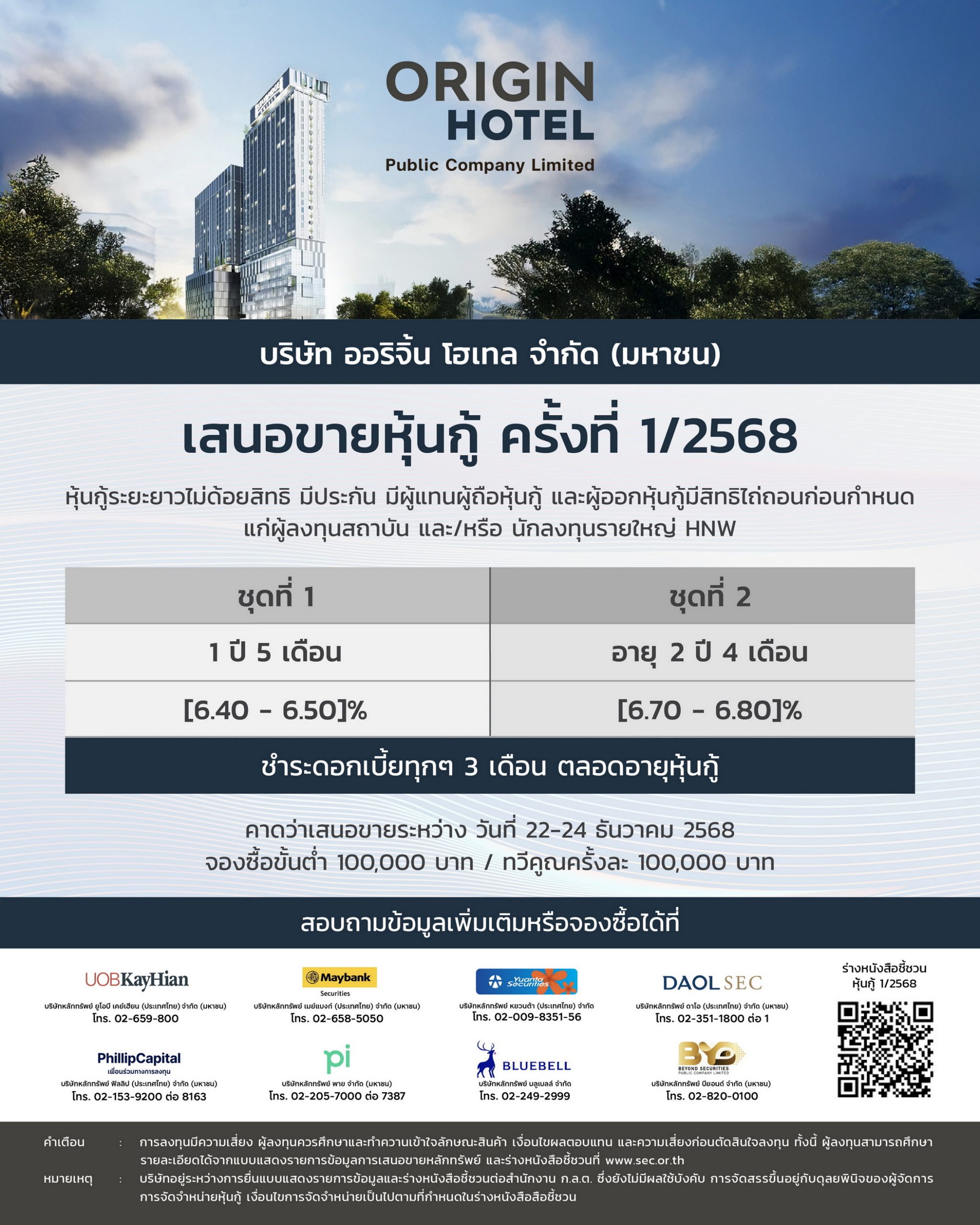 ออริจิ้น โฮเทล ยื่นไฟลิ่งเตรียมเสนอขายหุ้นกู้ครั้งที่ 1/2568 จ่ายดอกเบี้ยทุก 3 เดือน ตลอดอายุหุ้นกู้ อัตราดอกเบี้ย [6.40-6.80]% ต่อปี เตรียมเปิดจองวันที่ 22-24 ธันวาคม 2568 ผ่านบริษัทหลักทรัพย์สถาบันการเงินทั้ง 8 แห่ง