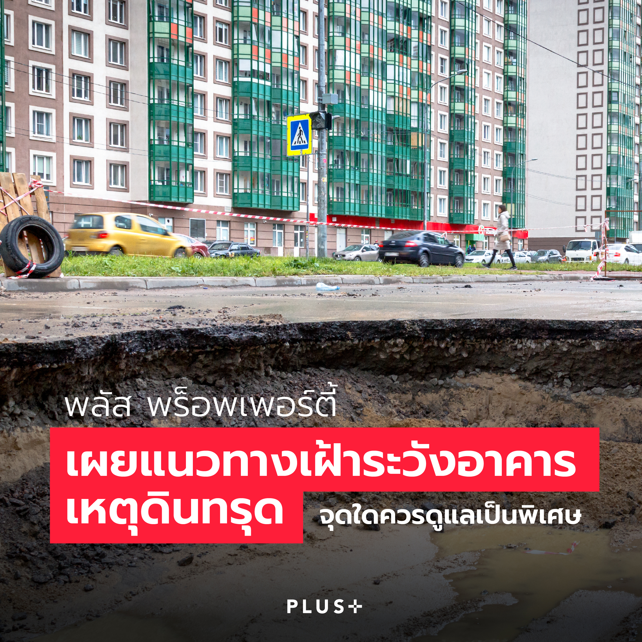นายภคิน เอกอธิคม ผู้อำนวยการฝ่ายบริหารทรัพยากรอาคาร บริษัท พลัส พร็อพเพอร์ตี้ จำกัด เปิดเผยว่า อาคารที่ควรเฝ้าระวังเรื่องการทรุดตัวมากเป็นพิเศษ ได้แก่ พื้นที่ติดแหล่งน้ำ และ พื้นที่ใกล้การก่อสร้างขนาดใหญ่ โดยปกติ ทีมบริหารจัดการอาคารจะมีรอบในการตรวจสอบพื้นที่โดยรอบตัวอาคารเบื้องต้นผ่านการตรวจด้วยสายตา (Visual Check) อยู่แล้ว ซึ่งอาจตรวจพบรอยแตกร้าวหรือระดับพื้นผิวของพื้นที่ต่างๆ มีการทรุดตัว เช่น ทางเดิน ถนน สนามหญ้า กำแพงรั้ว ที่เปลี่ยนแปลงไปจากปกติ จนอาจส่งผลกระทบต่อความปลอดภัยและการใช้งานอาคาร ก็จำเป็นต้องมีการตรวจละเอียดโดยผู้เชี่ยวชาญ เช่น วิศวกรโยธา เพื่อประเมินความเสียหาย และหาแนวทางแก้ปัญหาต่อไป