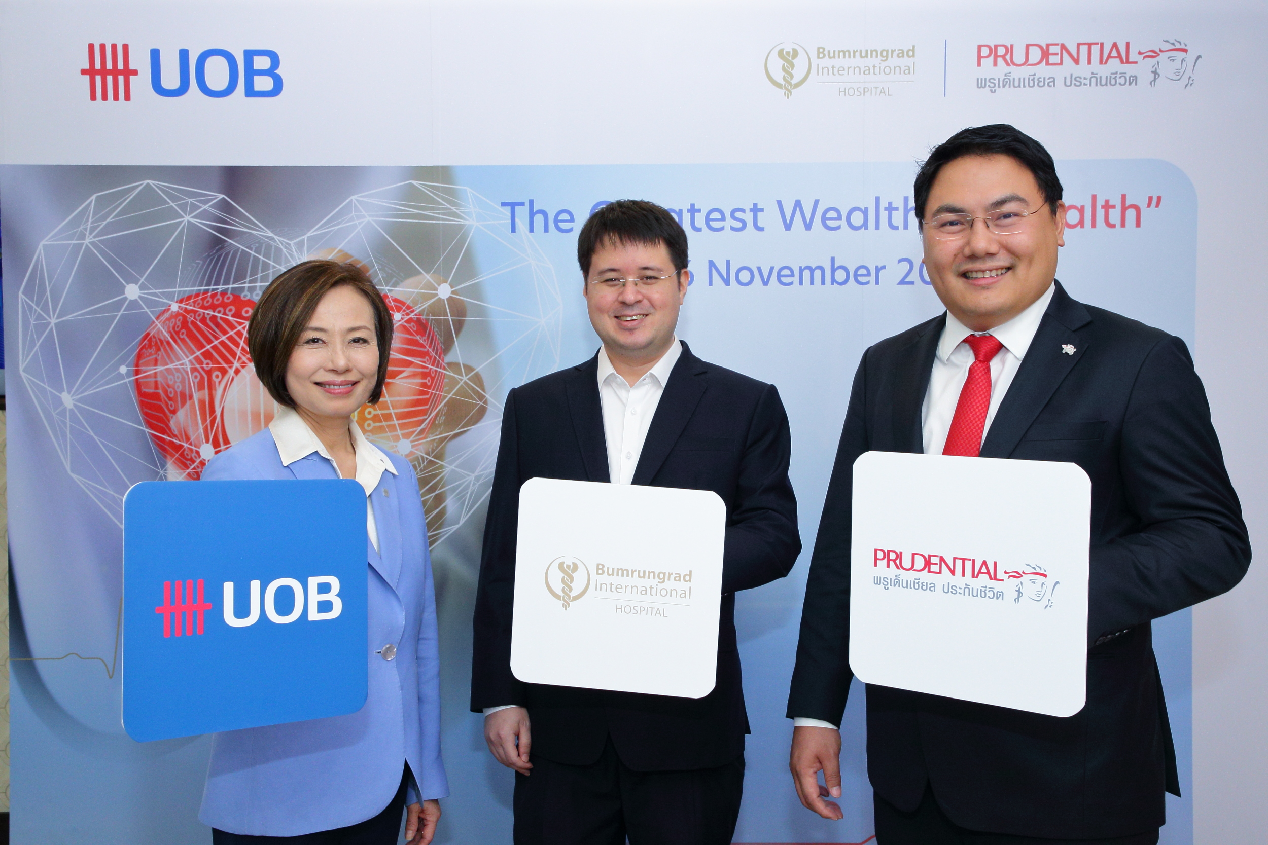 นายดอน จรรย์ศุภรินทร์ (ขวาสุด) ประธานเจ้าหน้าที่บริหาร สายงานการพาณิชย์ พรูเด็นเชียล ประเทศไทย พร้อมด้วย นางสาวปิยพร รัตน์ประสาทพร ผู้ช่วยกรรมการผู้จัดการใหญ่หัวหน้าหน่วยงานเครือข่ายสาขาและบริการดิจิทัล ธนาคารยูโอบี จำกัด (มหาชน) และนายแดเนียล คาสเนอร์ Chief Transformation Officer โรงพยาบาลบำรุงราษฎร์ ร่วมจัดกิจกรรม “UOB Total Wellness” ภายใต้หัวข้อ“THE GREATEST WEALTH IS HEALTH” ให้แก่ลูกค้าธนาคารยูโอบี เพื่อให้ความรู้ด้านสุขภาพ และการวางแผนการเงิน เพื่อสุขภาพที่ดีแบบครบวงจร โดยภายในงานมีแพทย์ผู้เชี่ยวชาญจากโรงพยาบาลบำรุงราษฎร์ มาบรรยายให้ความรู้ด้านสุขภาพ และยังมีผู้เชี่ยวชาญด้านประกันชีวิตจากพรูเด็นเชียล ประเทศไทย มาให้ความรู้ด้านการวางแผนทางการเงินเพื่อป้องกันความเสี่ยงด้านสุขภาพ และการเงินที่อาจเกิดขึ้นในอนาคต พร้อมด้วยข้อเสนอส่วนลดโปรแกรมตรวจสุขภาพเชิงลึกมาตรฐานจากโรงพยาบาลบำรุงราษฎร์ และรับเครดิตเงินคืนสำหรับลูกค้าที่ซื้อผลิตภัณฑ์ประกันชีวิต UOB healthy Wealth และ UOB Healthcare Plus นอกจากนี้สำหรับลูกค้ายูโอบี ยังสามารถเข้าร่วมกิจกรรมและเยี่ยมชม Total Wellness Corner ได้ที่ธนาคารยูโอบี สาขาสามแยก และรับสิทธิประโยชน์มากมาย ตั้งแต่วันนี้จนถึง 31 ธันวาคม 2566