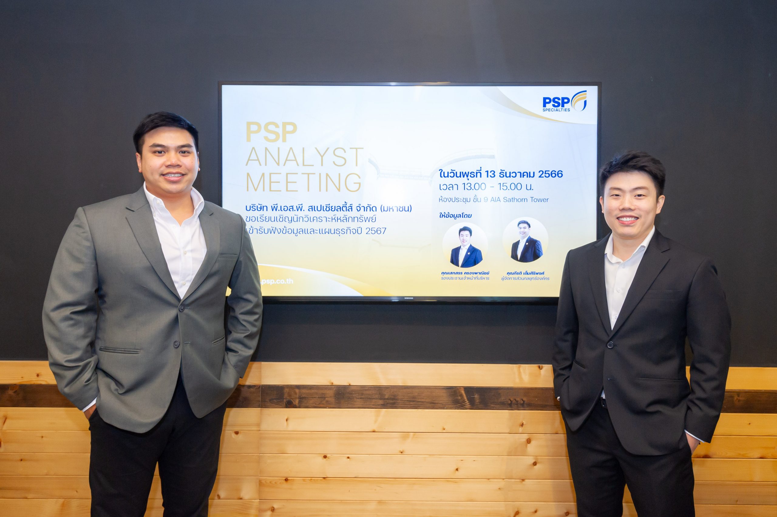คุณเสกสรร ครองพาณิชย์ (ขวา) รองประธานเจ้าหน้าที่บริหาร และคุณกีรติ เต็มศิริพงศ์ (ซ้าย) ผู้จัดการส่วนกลยุทธ์องค์กร บมจ. พี.เอส.พี. สเปเชียลตี้ส์ จำกัด (มหาชน) (PSP) ร่วมให้ข้อมูลภาพรวมและแผนการดำเนินธุรกิจปี 2567 กับนักวิเคราะห์หลักทรัพย์ ในงาน Analyst Meeting โดยผู้บริหารมั่นใจว่าแนวโน้มผลประกอบการปี 2567 จะเติบโตอย่างแข็งแกร่ง โดยมุ่งเน้นการขยายธุรกิจผลิตภัณฑ์หล่อลื่นในตลาดต่างประเทศ ควบคู่ไปกับการพัฒนาผลิตภัณฑ์หล่อลื่นและน้ำยาหล่อเย็นแบตเตอรี่สำหรับรถยนต์ไฟฟ้า น้ำมันหล่อลื่นและจาระบี Food Grade ในภาคอุตสาหกรรมอาหาร รวมไปถึงน้ำมันผสมยางและน้ำมันหม้อแปลงไฟฟ้าชีวภาพ พร้อมลุยตลาด B2C สร้างโอกาสธุรกิจใหม่หลังเปิดตัว 3 ผลิตภัณฑ์ ทั้งผลิตภัณฑ์หล่อลื่นอเนกประสงค์, สเปรย์ทำความสะอาดเครื่องปรับอากาศ และสเปรย์ขจัดกลิ่นไม่พึงประสงค์ ตอกย้ำผู้นำธุรกิจหล่อลื่นครบวงจรชั้นนำของประเทศ งานดังกล่าวจัดขึ้น ณ อาคารเอไอเอ สาทร ทาวเวอร์ เมื่อวันที่ 13 ธันวาคม 2566 ที่ผ่านมา