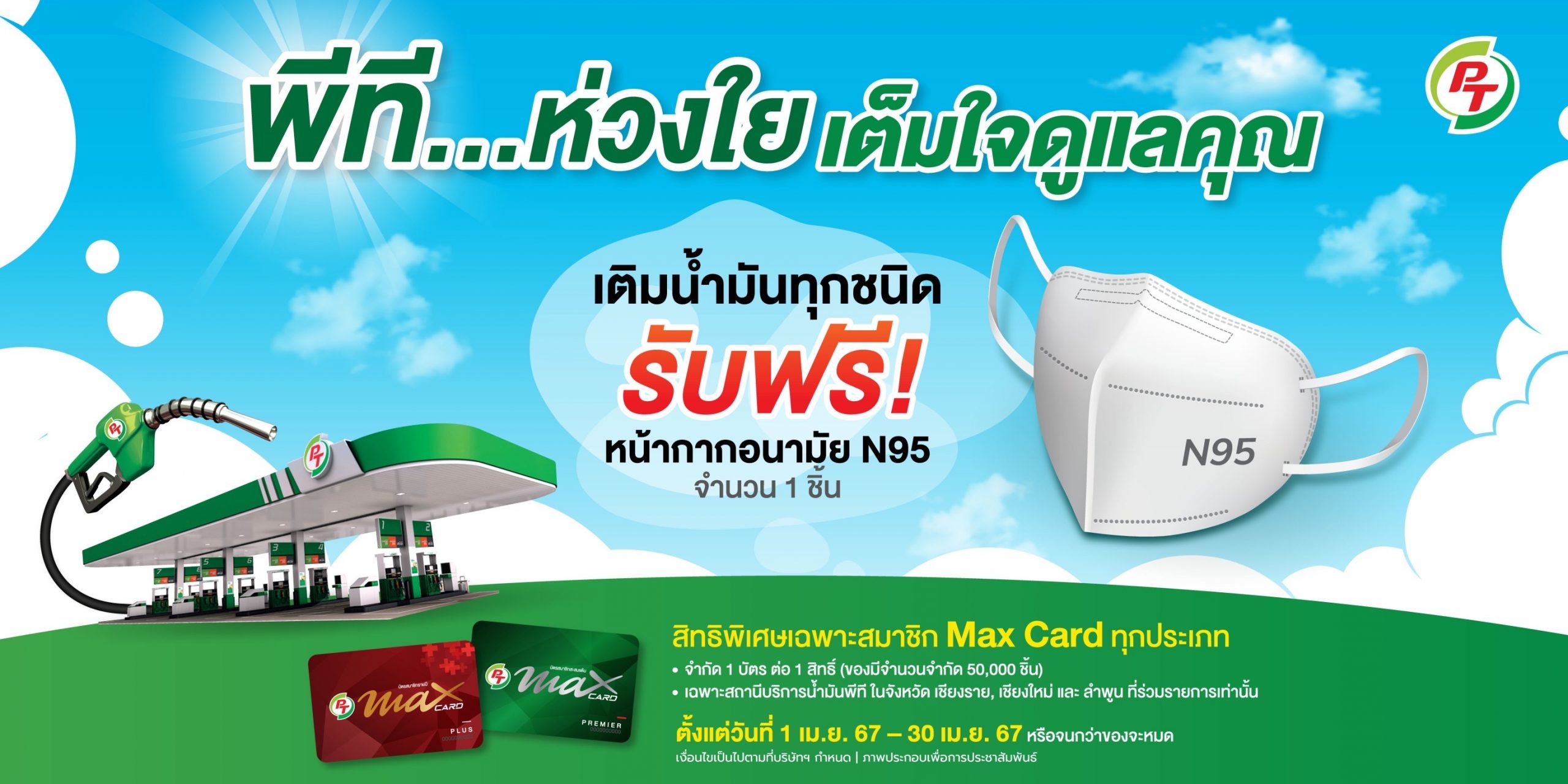 บริษัทพีทีจี เอ็นเนอยี จำกัด (มหาชน) (PTG) เติมเต็มความห่วงใยให้กับลูกค้าสมาชิกในพื้นที่ภาคเหนือ สืบเนื่องจากสถานการณ์ฝุ่นละออง PM 2.5 ซึ่งส่งผลทำให้คุณภาพอากาศอยู่ในระดับที่มีผลกระทบต่อสุขภาพของประชาชน จากสถานการณ์ดังกล่าว PTG จึงแจกหน้ากากอนามัยให้กับลูกค้าสมาชิกบัตร PT Max Card ทุกประเภทที่มาเติมน้ำมันพีทีชนิดใดก็ได้ เท่าใดก็ได้ในพื้นที่ 3 จังหวัดภาคเหนือที่ร่วมรายการ คือ เชียงราย จำนวน 53 สาขา เชียงใหม่ จำนวน 53 สาขา และลำพูน จำนวน 21 สาขา จะได้รับหน้ากาก N95 ฟรี 1 ชิ้น จำกัด 1 บัตร ต่อ 1 สิทธิ์ รวมจำนวน 50,000 ชิ้น โดยจะเริ่มแจกตั้งแต่วันที่ 1-30 เมษายน 2567 หรือจนกว่าของจะหมด