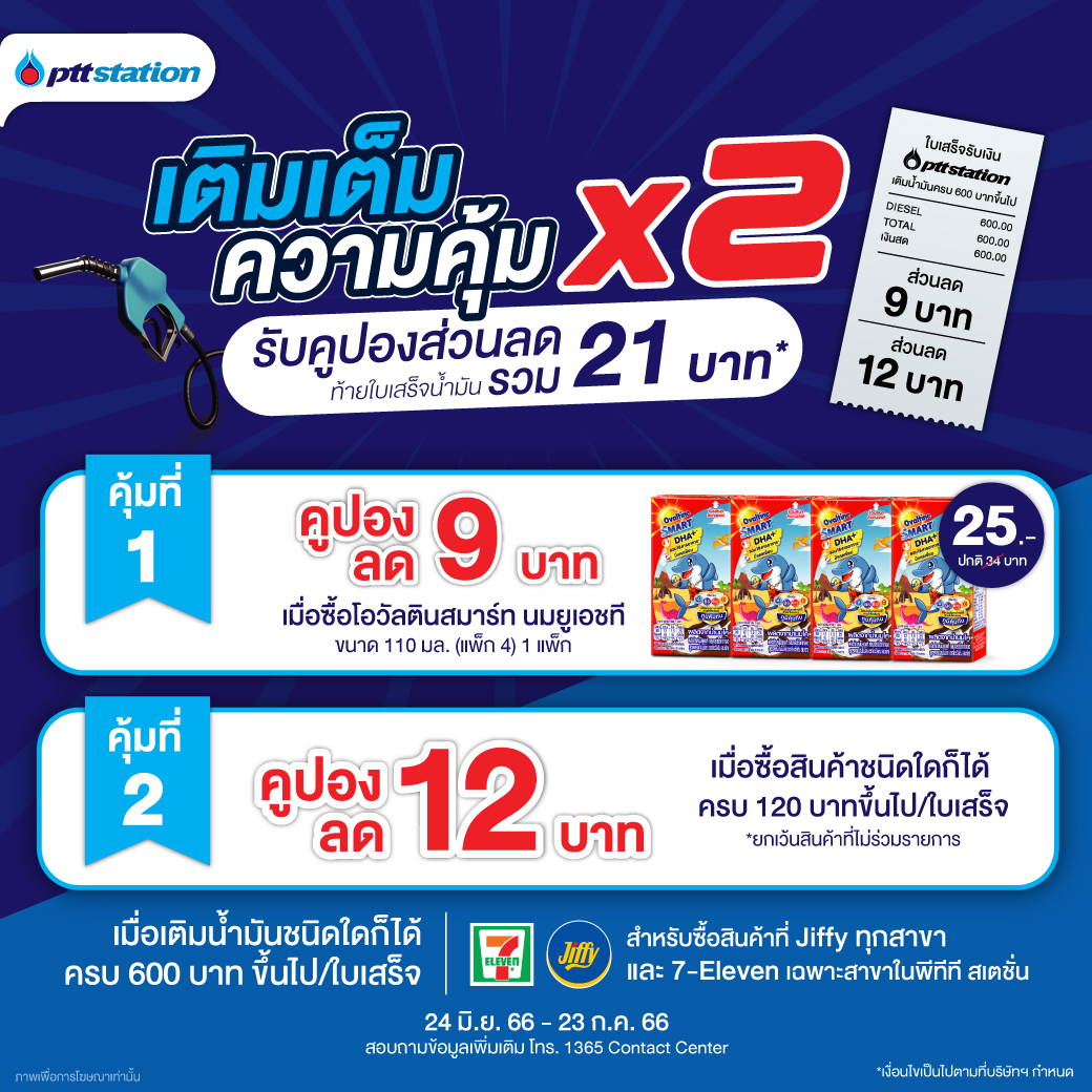 พีทีที สเตชั่น เติมน้ำมันวันนี้รับโปรโมชั่นพิเศษ “เติมเต็มความคุ้ม x2” ให้ได้เติมเต็มความคุ้ม 2 ต่อ เมื่อเติมน้ำมันทุกชนิดครบ 600 บาทขึ้นไป/ใบเสร็จ รับคูปองส่วนลดรวม 21 บาทท้ายใบเสร็จน้ำมัน สำหรับใช้ที่ร้านสะดวกซื้อ Jiffy ทุกสาขา และ 7-Eleven เฉพาะสาขาภายใน พีทีที สเตชั่น เท่านั้น!! (จำกัดแจกคูปอง 1 สิทธิ์/ใบเสร็จ)