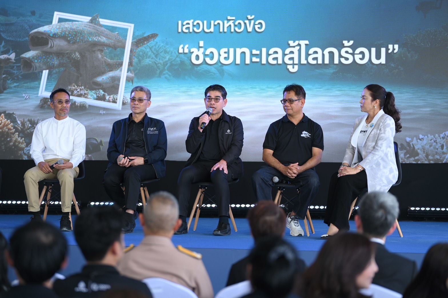 ภายในงานเปิดตัวประติมากรรมใต้ทะเลฯ ได้มีการเสวนาหัวข้อ “ช่วยทะเลสู้โลกร้อน” โดยมี นายอุกกฤต สตภูมินทร์ รองอธิบดีกรมทรัพยากรทางทะเลและชายฝั่ง, นายชยงค์ บริสุทธิ์สวัสดิ์ รองกรรมการผู้จัดการใหญ่ กลุ่มงานเทคโนโลยี คาร์บอนโซลูชั่นและการเติบโตอย่างยั่งยืน ปตท.สผ., ผศ.ดร.ธรณ์ ธำรงนาวาสวัสดิ์ รองคณบดีฝ่ายกิจการพิเศษ ภาควิชาวิทยาศาสตร์ทางทะเล คณะประมง มหาวิทยาลัยเกษตรศาสตร์, ผู้ช่วยศาสตราจารย์มานะ ไทวัฒนกุล หัวหน้าภาควิชาประติมากรรม คณะจิตรกรรม ประติมากรรมและภาพพิมพ์ มหาวิทยาลัยศิลปากร ซึ่งเป็นผู้สร้างสรรค์งานประติกรรมใต้ทะเล Ocean for Life และนางรำลึก อัศวชิน นายกสมาคมธุรกิจการท่องเที่ยวเกาะเต่า ร่วมแลกเปลี่ยนมุมมองเกี่ยวกับสถานการณ์และความท้าทายด้านสิ่งแวดล้อมทางทะเล รวมถึงแนวทางการการอนุรักษ์ท้องทะเลไทย