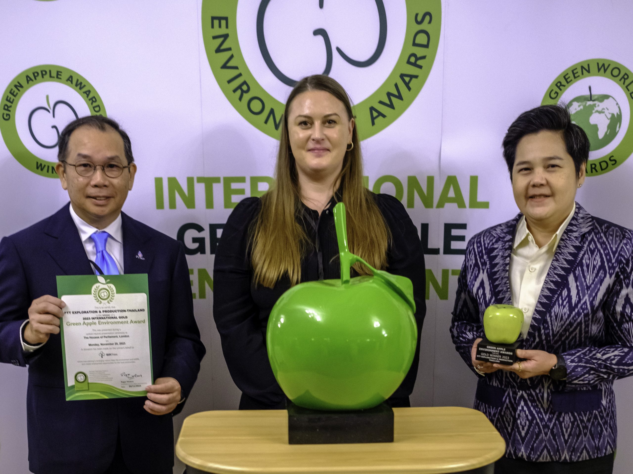 บริษัท ปตท.สำรวจและผลิตปิโตรเลียม จำกัด (มหาชน) หรือ ปตท.สผ. โดยนายนภสิทธิ์ ชัยวรรณคุปต์ (ซ้าย) รักษาการรองกรรมการผู้จัดการใหญ่ กลุ่มงานเทคโนโลยี คาร์บอนโซลูชั่นและการเติบโตอย่างยั่งยืน เข้ารับรางวัล International Green Apple Awards for Environmental Best Practice 2023 จาก The Green Organisation โดย ปตท.สผ. ได้รับรางวัลระดับ Gold ด้าน Environmental Improvement จากการดำเนินโครงการ ปตท.สผ. ปลูกป่าลดภาวะโลกร้อน พิธีมอบรางวัลจัดขึ้น ณ กรุงลอนดอน ประเทศอังกฤษ
