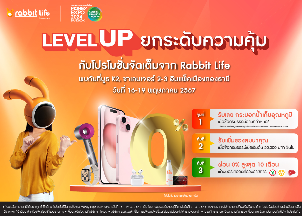 บริษัท แรบบิท ประกันชีวิต จำกัด (มหาชน) หรือ Rabbit Life เตรียมขนทัพโปรโมชันเด็ดแบบจัดหนักจัดเต็ม ร่วมงานมหกรรมการเงินกรุงเทพ ครั้งที่ 24 ( Money Expo Bangkok 2024) พร้อมยกระดับความคุ้มแบบ Level Up ให้แก่ลูกค้าคนพิเศษถึง 3 ต่อ ไม่ว่าจะเป็น คุ้มที่ 1 รับกระบอกน้ำเก็บอุณหภูมิสุดเก๋ เมื่อซื้อประกันทุกรูปแบบ คุ้มที่ 2 รับเพิ่มของสมนาคุณ อาทิ เช่น Iphone 14 Promax, AirPod Gen3, Apple Watch SE, ไดร์เป่าผม Dyson และอื่นๆอีกมากมาย เมื่อซื้อประกันเบี้ยเริ่มต้น 50,000 บาทขึ้นไป และคุ้มที่ 3 โปรโมชันผ่อน 0% นานสูงสุด 10 เดือน สำหรับลูกค้าที่ชำระผ่านบัตรเครดิตที่ร่วมรายการ (KTC, Krungsri และ KBANK) สิทธิพิเศษนี้เฉพาะสำหรับลูกค้าที่สมัครประกันชีวิตภายในงานเท่านั้น พบกันที่บูธ K2, ชาเลนเจอร์ 2-3 อิมแพ็คเมืองทองธานี ระหว่างวันที่ 16-19 พฤษภาคม 2567