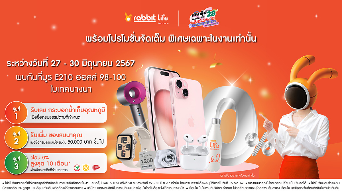พบกับผลิตภัณฑ์และโปรโมชันสุดคุ้มจากแรบบิท ประกันชีวิต ได้ที่บูธ E210 ฮอลล์ 98-100 ณ ไบเทคบางนา ระหว่างวันที่ 27-30 มิถุนายน 2567