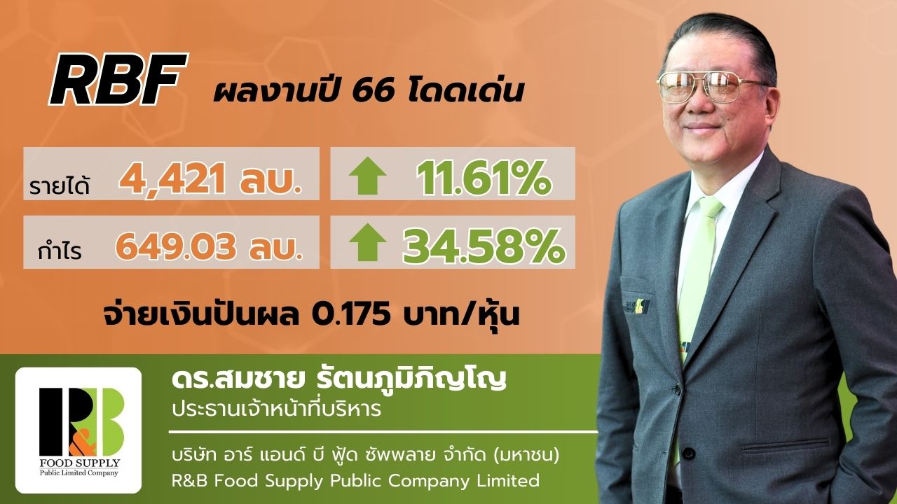 ดร.สมชาย รัตนภูมิภิญโญ ประธานเจ้าหน้าที่บริหาร บริษัท อาร์ แอนด์ บี ฟู้ด ซัพพลาย จำกัด (มหาชน) หรือ RBF ผู้ผลิตและจำหน่ายวัตถุที่ใช้เป็นส่วนผสมในอาหาร (Food Ingredients) ตามคำสั่งซื้อของลูกค้า และภายใต้ตราสินค้าของบริษัท เช่น อังเคิลบาร์นส์, เบสท์ โอเดอร์ และ super-find เปิดเผยผลการดำเนินงานในปี 2566 (สิ้นสุด 31 ธันวาคม 2566) ว่า บริษัทฯ มีกำไรสุทธิ 649.03 ล้านบาท เพิ่มขึ้น 34.58% จากปีก่อน ที่มีกำไรสุทธิ 482.27 ล้านบาท และมีรายได้จากการขายและให้บริการ 4,421.11 ล้านบาท เพิ่มขึ้น 459.90 ล้านบาท หรือ 11.61% จากปีก่อน ที่มีรายได้จากการขายและให้บริการ 3,961.21 ล้านบาท