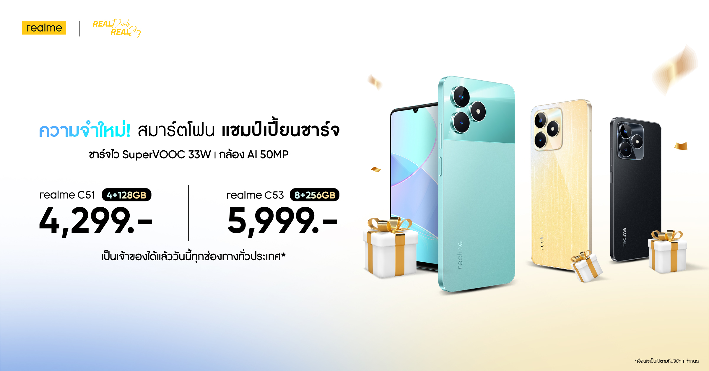 ในช่วงเทศกาลแห่งความสุขส่งท้ายปี (เรียลมี) แบรนด์สมาร์ตโฟนเพื่อคนรุ่นใหม่ที่เติบโตเร็วที่สุดในโลก พร้อมจัดโปรโมชัน real deals real joy มอบโปรโมชันส่วนลดและของสัมนาคุณพิเศษมากมาย ไม่เพียงเท่านั้น เรียลมียังพร้อมส่งหน่วยความจำใหม่ในสมาร์ตโฟน 2 รุ่นยอดฮิตระดับ Entry-level กับ realme C53 รุ่น 8/256GB ราคา 5,999 บาท และ realme C51 รุ่น 4/128GB ราคา 4,299 บาท ให้คุณเป็นเจ้าของสมาร์ตโฟนแชมเปี้ยนแห่งเซกเมนต์ พร้อมการอัปเกรดประสิทธิภาพ 4 ฟีเจอร์ ทั้งกล้องถ่ายภาพ ระบบชาร์จไว ดีไซน์สุดหรูเกินราคา และหน่วยความจำประสิทธิภาพสูง ให้คุณเลือกรุ่นที่ใช่ในราคาที่ชอบแบบสบายกระเป๋า เพราะขึ้นชื่อว่าสมาร์ตโฟนเรียลมี จะซื้อให้ตัวเองก็ถูกใจ ซื้อเป็นของขวัญจับฉลากหรือของกำนัลปีใหม่ ก็สร้างความประทับใจแก่ผู้รับอย่างแน่นอน!
