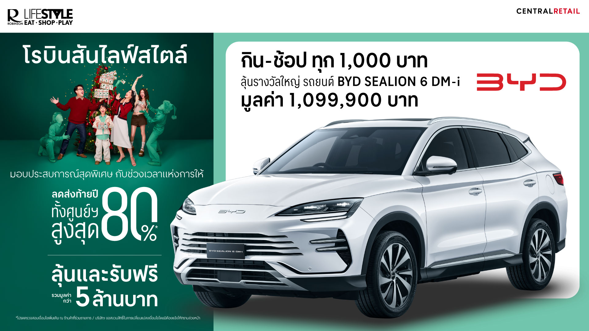ร่วมเป็นส่วนหนึ่งของประสบการณ์แห่งความสุขส่งท้ายปี กับแคมเปญ “โรบินสันไลฟ์สไตล์ มอบประสบการณ์พิเศษ กับช่วงเวลาแห่งการให้” เพียงช้อปครบตามเงื่อนไข รับสิทธิ์ลุ้นรางวัลใหญ่รถยนต์ปลั๊กอินไฮบริด BYD รุ่น SEALION 6 DM-i มูลค่า 1.09 ล้านบาทพร้อมดีลสุดคุ้มจากหลากหลายร้านค้า ตั้งแต่วันนี้–4 ม.ค. 69 ที่ศูนย์การค้าโรบินสันไลฟ์สไตล์ทุกสาขา ทั่วประเทศ
