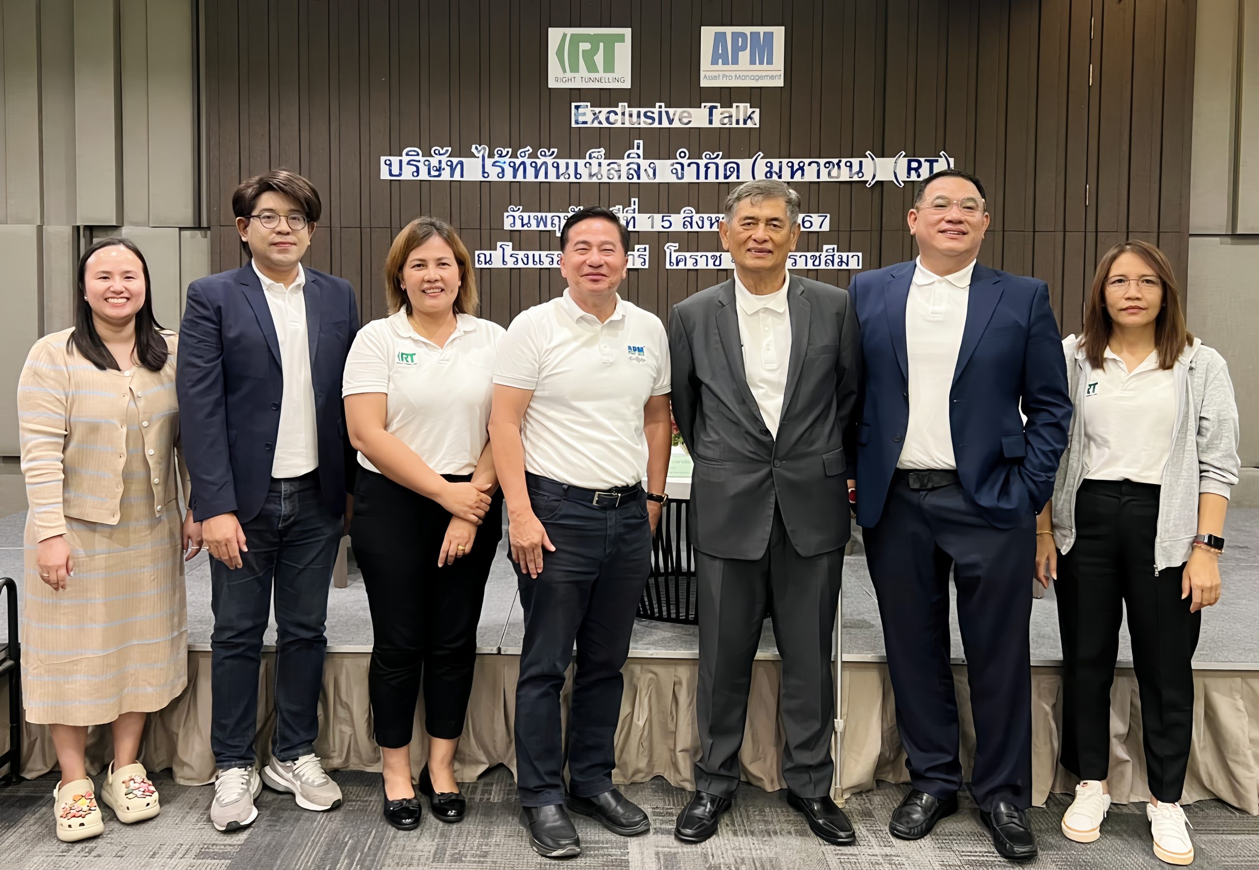 นายชวลิต ถนอมถิ่น (ที่ 3 จากขวา) ประธานเจ้าหน้าที่บริหาร ร่วมด้วย นายไชยา วงศ์ลาภพานิช (ที่ 2 จากขวา) กรรมการผู้จัดการ, นางเมชญา แก้วดวงดี (ที่ 3 จากซ้าย) รองกรรมการผู้จัดการสายงานบริหาร,นายปรเมษฐ์ มัชฌิมา (ที่ 2 จากซ้าย) ผู้ช่วยกรรมการผู้จัดการสายงานบัญชีและการเงิน และ ทีมงานบริษัท ไร้ท์ทันเน็ลลิ่ง จำกัด (มหาชน) (RT) พร้อมด้วย ดร.สมภพ ศักดิ์พันธ์พนม (กลาง) ประธานกรรมการและ ทีมงานบริษัท แอสเซท โปร แมเนจเม้นท์ จำกัด (APM) ร่วมงาน ”Exclusive Talk” เพื่อนำเสนอข้อมูลบริษัท และ โอกาสการเติบโตแก่นักลงทุน โดยมีผู้สนใจเข้าร่วมฟังเป็นจำนวนมาก ณ โรงแรมแคนทารี โคราช จ.นครราชสีมา