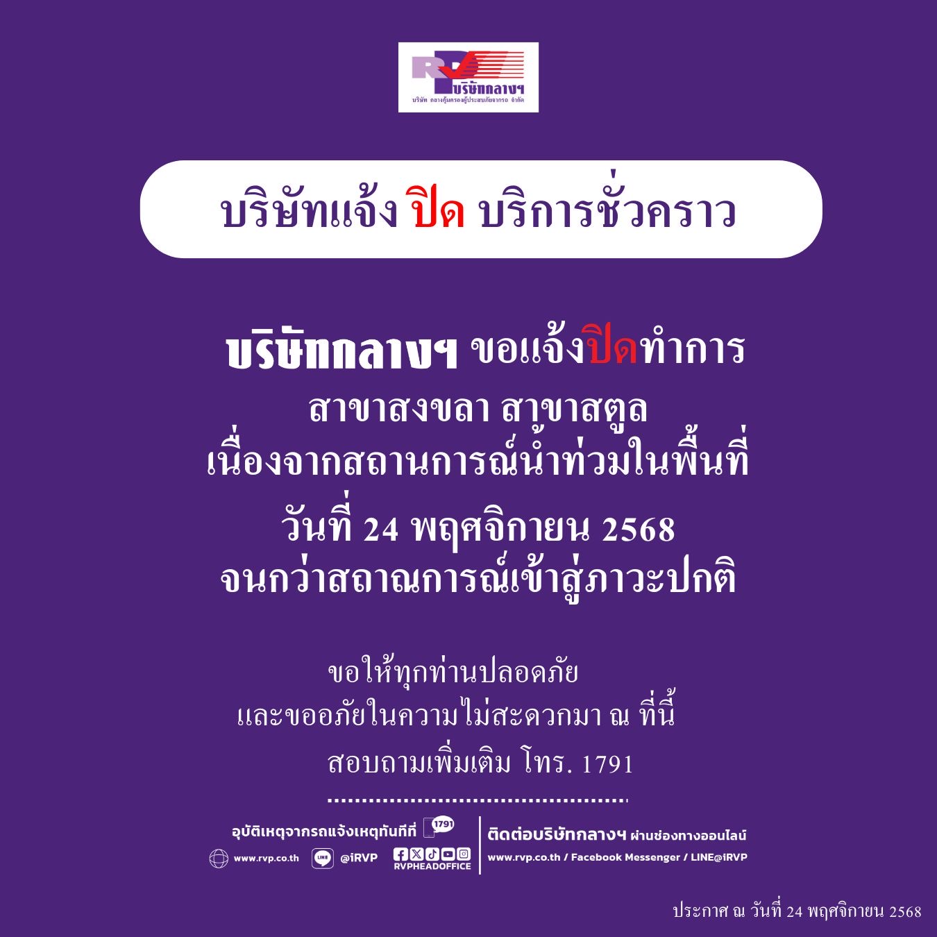 เนื่องจากเกิดสถานการณ์น้ำท่วมในเขตอำเภอหาดใหญ่ จังหวัดสงขลาและอำเภอเมือง จังหวัดสตูล ทำให้มีปริมาณน้ำท่วมสูงบริเวณโดยรอบบริษัทกลางฯ รถไม่สามารถสัญจรไปมาได้ ส่งผลกระทบให้กระแสไฟฟ้าในพื้นที่ถูกตัด นอกจากนี้มีปริมาณน้ำเข้าภายในสาขา จนไม่สามารถเปิดให้บริการได้ ทางบริษัทจึงประกาศปิดให้บริการบริษัทกลางฯ สาขาสงขลาและสตูล ชั่วคราว ในวันที่ 24 พฤศจิกายน 2568 โดยจะปิดจนกว่าสถานการณ์จะดีขึ้นและให้กลับมาปฏิบัติงานตามปกติ และขอให้ติดตามประกาศของบริษัทต่อไป