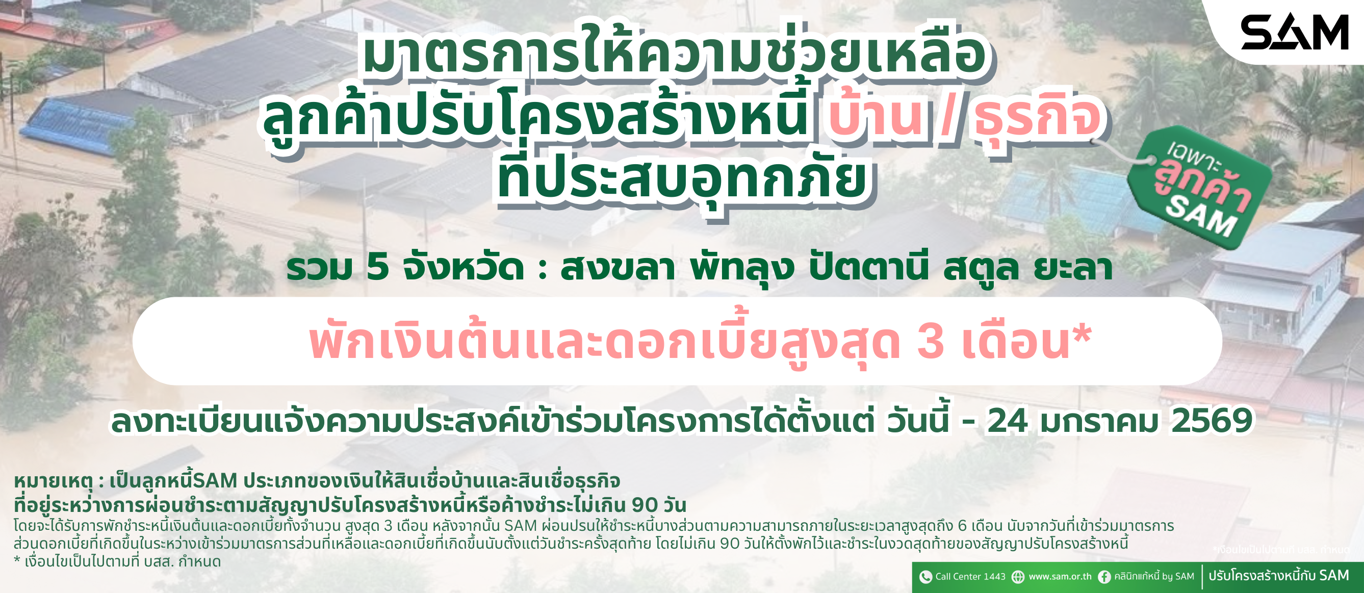 ส่วนดอกเบี้ยที่เกิดขึ้นในระหว่างเข้าร่วมมาตรการส่วนที่เหลือ และดอกเบี้ยที่เกิดขึ้นนับตั้งแต่วันชำระครั้งสุดท้ายโดยไม่เกิน 90 วัน ให้ตั้งพักไว้และชำระในงวดสุดท้ายของสัญญาปรับโครงสร้างหนี้ เงื่อนไขเป็นไปตามที่ SAM กำหนด ลูกค้าสามารถแจ้งความประสงค์เข้าร่วมโครงการได้ตั้งแต่บัดนี้–24 มกราคม 2569 เพื่อให้ SAM เร่งดำเนินการบรรเทาความเดือดร้อนได้อย่างรวดเร็ว