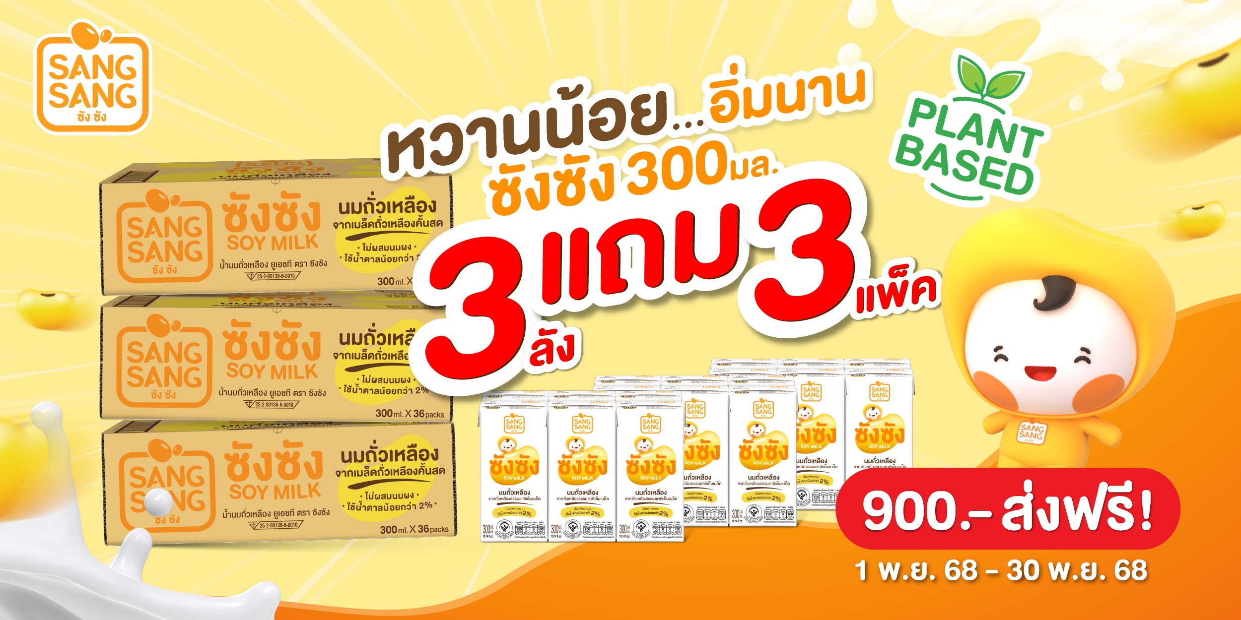 “ซังซัง” หวานน้อยอร่อยหอมมัน นมถั่วเหลืองหอมมันแบบคั้นสด ผลิตจากเมล็ดถั่วเหลืองคุณภาพสูงจากประเทศแคนาดา ที่มีน้ำตาลน้อยกว่า 2% ให้โปรตีนแบบเน้น ๆ ส่งโปรดี โปรเด็ด โปรโดนใจที่ทุกคนพากันรอคอย “ซังซัง หวานน้อย…อิ่มนาน” เมื่อซื้อซังซัง ขนาด 300 มล. 3 ลัง (ลังละ 36 กล่อง) แถมฟรีไปเลยอีก 3 แพ็ค ในราคาสุดคุ้มเพียง 900 บาท แถมยังส่งฟรีถึงหน้าบ้าน ไม่ต้องไปแบกเองให้หนัก โปรดี ๆ แบบนี้มีให้ตลอดเดือนพฤศจิกายน 68 นี้เท่านั้น