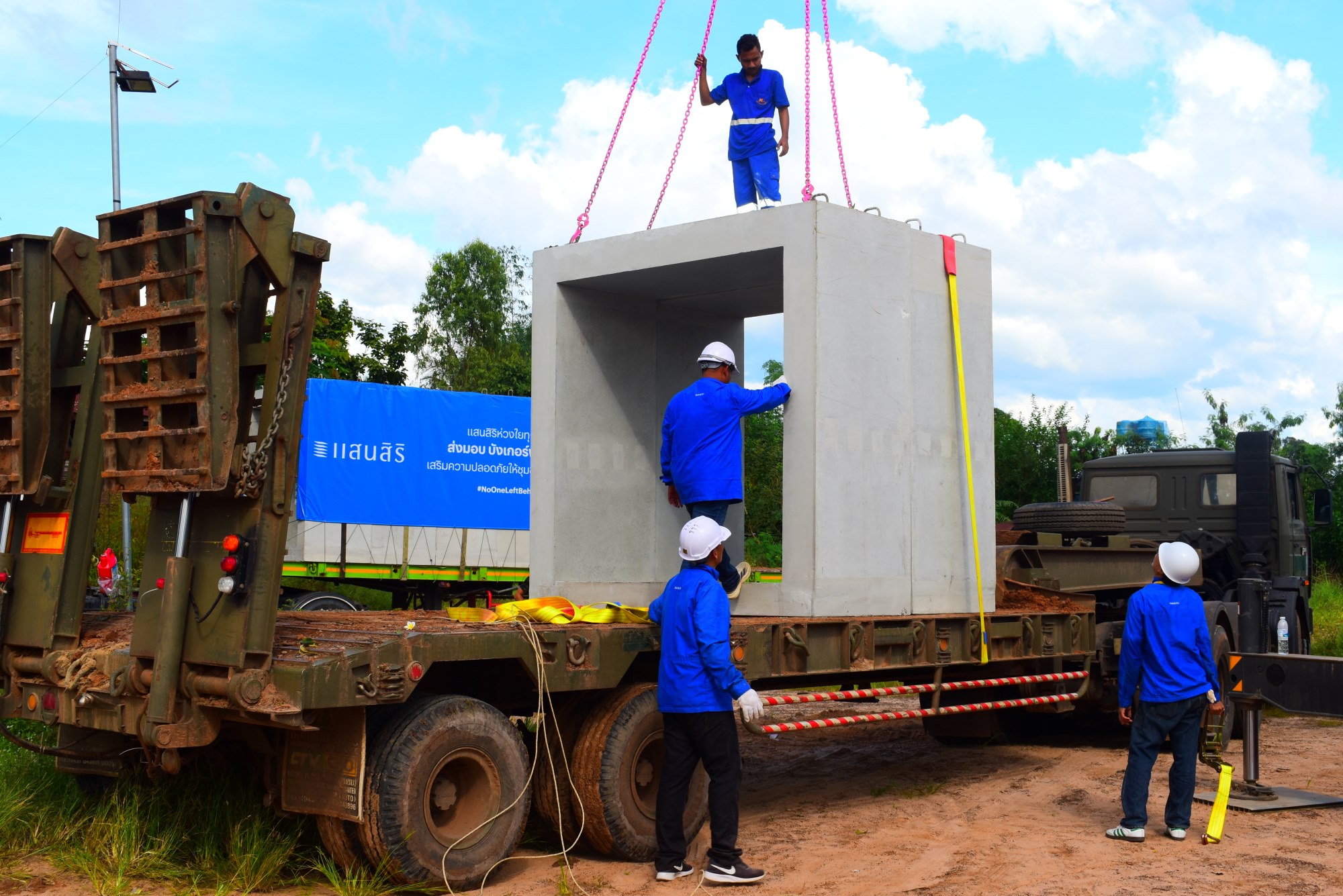 ภารกิจสำคัญครั้งนี้ สานต่อจากการลงพื้นที่ครั้งก่อน ทีมจิตอาสาแสนสิริและทีมติดตั้งจากโรงงานพรีคาสท์ ได้เร่งดำเนินการนำบังเกอร์ไปติดตั้งให้กับชุมชนในจังหวัดอุบลราชธานี โดยบังเกอร์ชุดนี้ไม่ได้เป็นเพียงที่กำบังทั่วไป แต่ถูกพัฒนาขึ้นด้วย เทคโนโลยีล่าสุดจากโรงงานพรีคาสท์ของแสนสิริ โดยใช้ “แผ่นกรีนพรีคาสท์ (Green Precast)” ซึ่งเป็นแผ่นคอนกรีตสำเร็จรูปเสริมเหล็กที่ถูกพัฒนาขึ้นเป็นพิเศษ ที่มีความทนทานต่อแรงกระแทกสูง ด้วยโครงสร้างที่แน่นหนาและเสริมเหล็กอย่างเป็นระบบ ทำให้สามารถรับมือกับแรงสั่นสะเทือนหรือแรงระเบิดในระยะไกลได้อย่างมีประสิทธิภาพ เป็นมิตรต่อสิ่งแวดล้อมและผู้ใช้งาน ช่วยลดอุณหภูมิความร้อนภายใน ทำให้ทหารสามารถปฏิบัติหน้าที่ได้อย่างสะดวกขึ้น และที่สำคัญคือความรวดเร็วในการติดตั้ง ด้วยระบบการเชื่อมต่อที่ออกแบบมาโดยเฉพาะ ทำให้การประกอบบังเกอร์ทั้งหมดนี้ใช้เวลาเพียงหนึ่งสัปดาห์ และในอนาคตยังสามารถปรับเปลี่ยนเป็นที่พักอาศัยหรือการใช้งานอื่นๆ ได้
