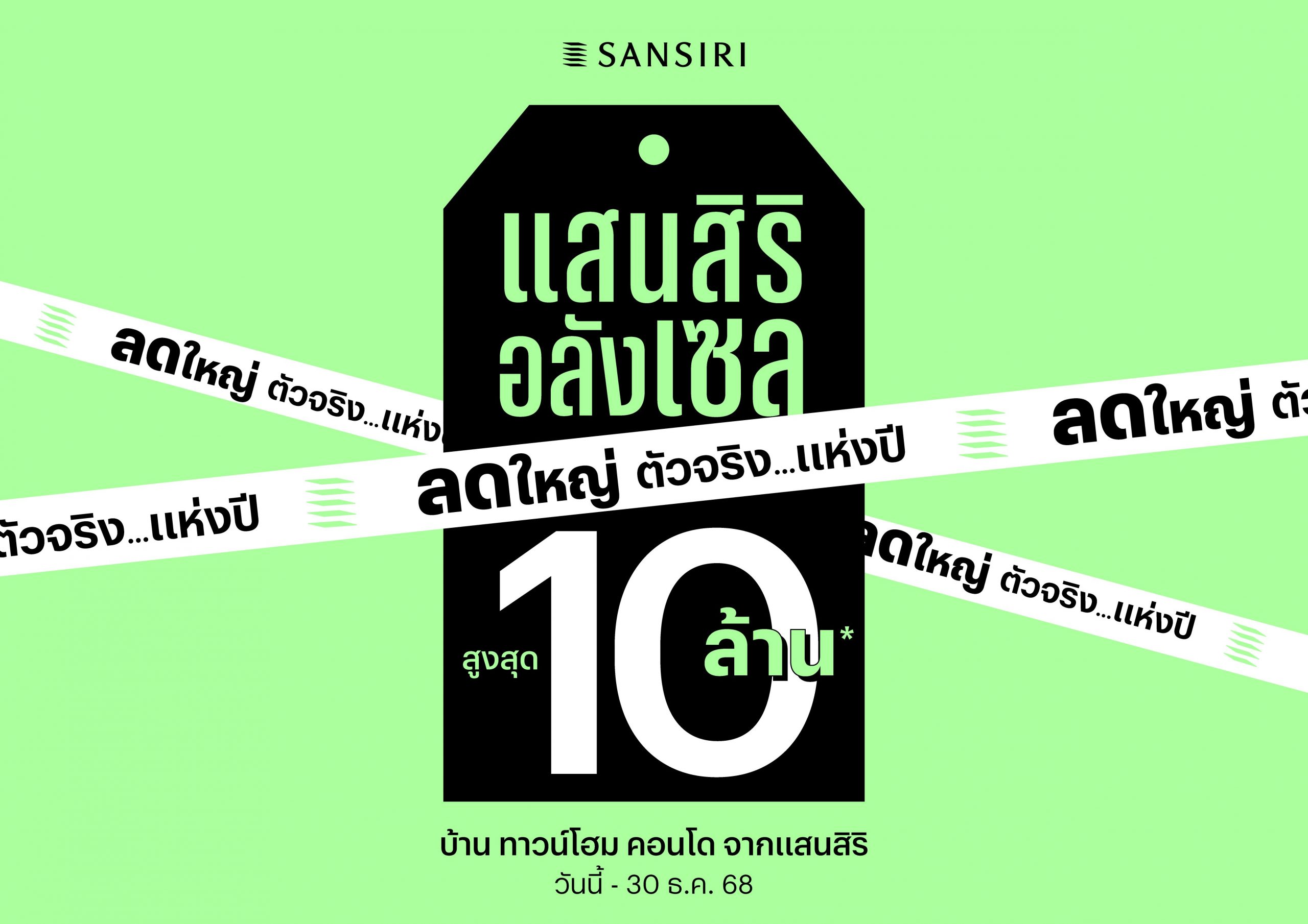 เพื่อตอบรับเสียงเรียกร้องจากลูกค้า แสนสิริ เดินหน้ามอบดีลใหญ่สุดพิเศษ ต่อเนื่องทันที กับ “แสนสิริ อลังเซล” ลดใหญ่ ตัวจริง…แห่งปี ลดสูงสุด 10 ล้านบาท กับบ้าน คอนโดมิเนียม และทาวน์โฮม รวมกว่า 109 โครงการ ราคาพิเศษทุกยูนิต เริ่มต้น 8.9 แสน–29.9 ล้านบาท พร้อมอัตราดอกเบี้ยจากธนาคารพันธมิตรชั้นนำ ผ่อนต่ำเริ่มต้นล้านละ 2,500 บาท และโปรโมชันอื่นๆ อีกมากมาย เริ่มตั้งแต่ 3 พ.ย.–30 ธ.ค. 68 ให้ทุกคนได้มีบ้านใหม่ต้อนรับปีใหม่ ด้วยข้อเสนอแห่งปี