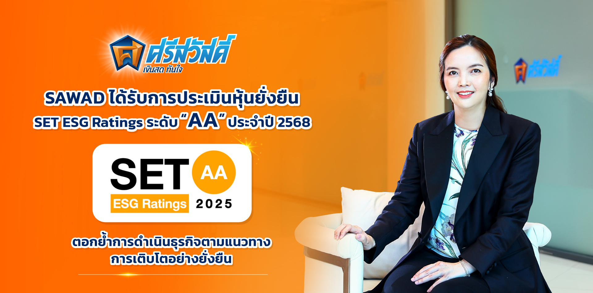 บริษัท ศรีสวัสดิ์ คอร์ปอเรชั่น จำกัด (มหาชน) หรือ SAWAD ได้รับการประเมินหุ้นยั่งยืน SET ESG Ratings ระดับ “AA” ในกลุ่มธุรกิจการเงิน (Financials) ประจำปี 2568 จัดขึ้นโดยตลาดหลักทรัพย์แห่งประเทศไทย สะท้อนถึงการดำเนินธุรกิจที่ให้ความสำคัญกับปัจจัยด้านสิ่งแวดล้อม สังคม และบรรษัทภิบาล (ESG) อย่างรอบด้าน และการบริหารจัดการองค์กรที่มีความรับผิดชอบ โปร่งใส และเติบโตอย่างมั่นคงในระยะยาว