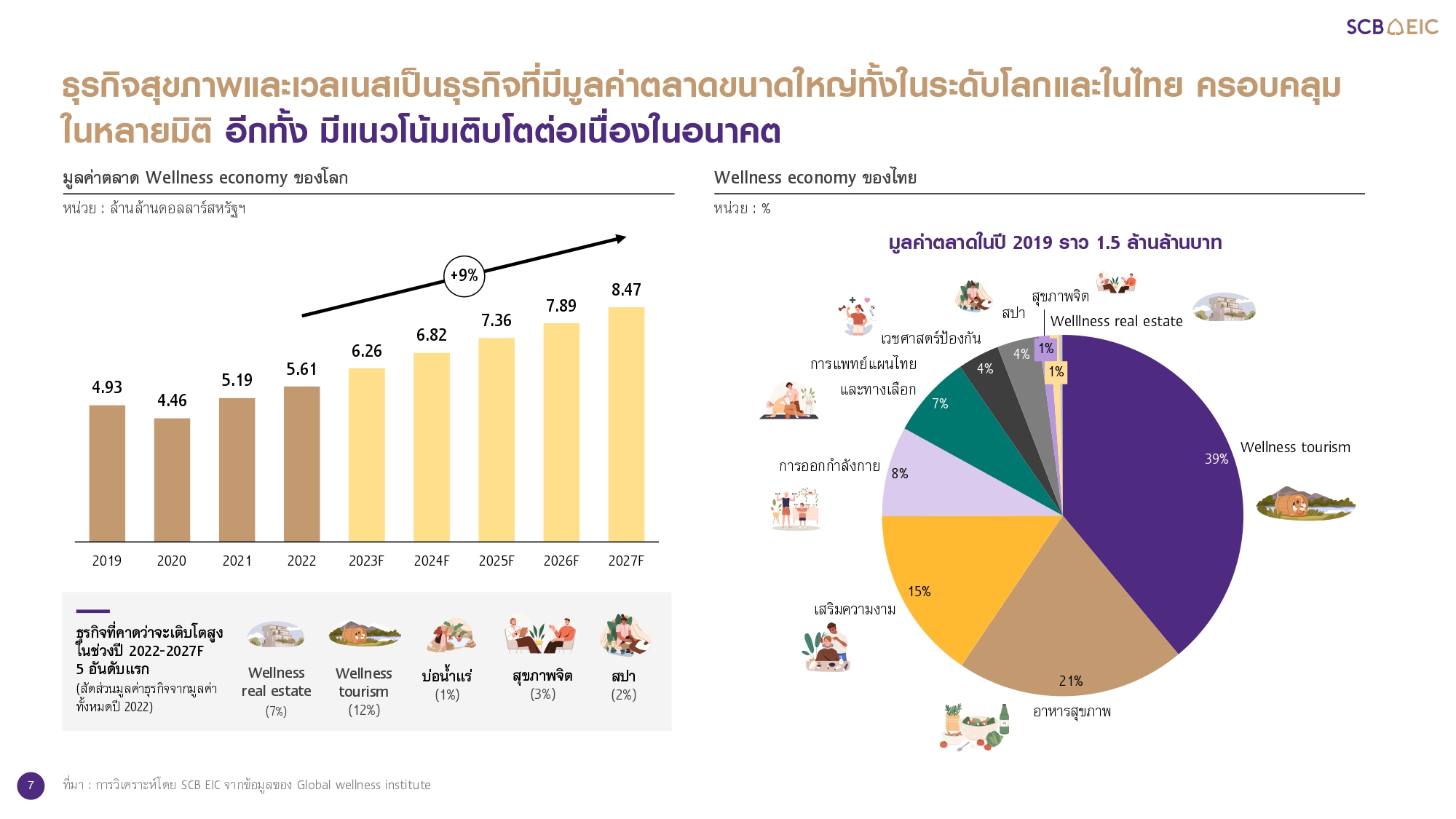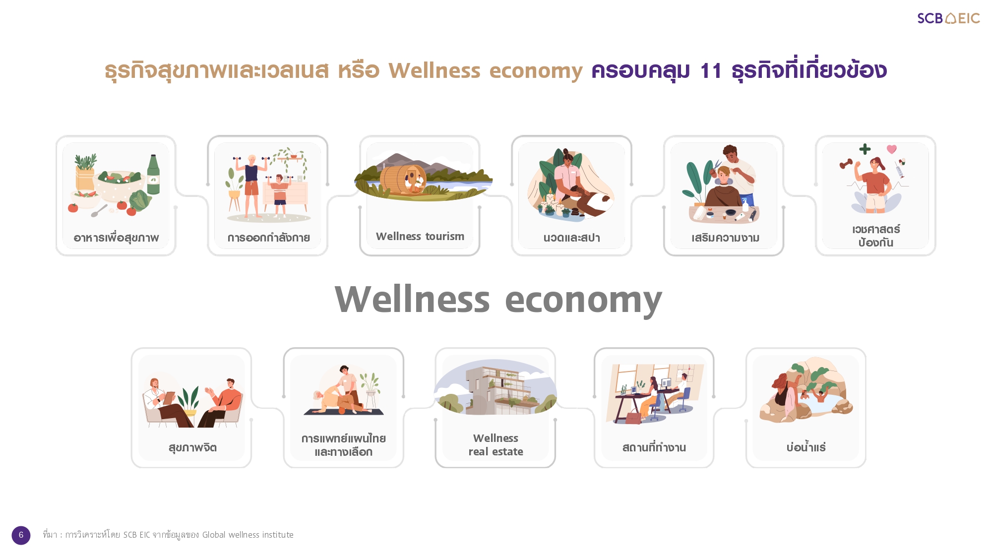 SCB EIC ได้สำรวจผู้บริโภคชาวไทยในด้านสุขภาพและเวลเนสพบว่า หลังผ่านวิกฤตโควิด-19 ผู้บริโภคชาวไทยให้ความใส่ใจต่อสุขภาพเพิ่มสูงขึ้น โดยความใส่ใจสุขภาพที่มากขึ้นจะช่วยส่งเสริมให้เกิดการใช้บริการด้านสุขภาพและเวลเนสเพิ่มสูงขึ้นตามมาโดยเฉพาะในกลุ่มธุรกิจสุขภาพและเวลเนสด้านบริการและการท่องเที่ยว ซึ่งแต่ละธุรกิจมีฐานลูกค้าหลักและพฤติกรรมการใช้บริการของผู้บริโภคที่แตกต่างกันค่อนข้างชัดเจน