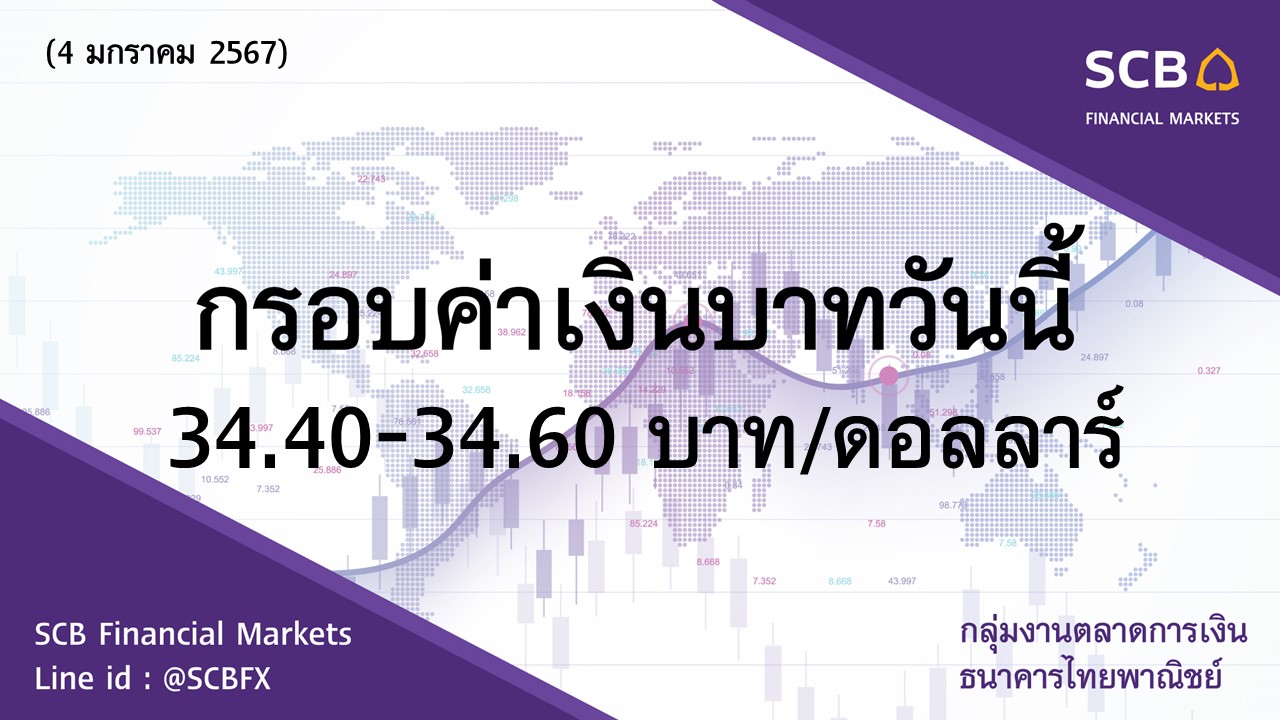 กลุ่มงานตลาดการเงิน ธนาคารไทยพาณิชย์ ประเมินค่าเงินบาทวันนี้เคลื่อนไหวในกรอบ 34.40-34.60 บาท/ดอลลาร์ เงินบาทอ่อนค่าลงเช้านี้หลังเงินดอลลาร์สหรัฐปรับแข็งค่าขึ้น จากรายงานการประชุม FOMC ที่ส่งสัญญาณว่าธนาคารกลางสหรัฐ (เฟด) อาจลดดอกเบี้ยภายในสิ้นปี พร้อมปรับคาดการณ์เงินเฟ้อลง เลข ISM ภาคการผลิตของสหรัฐฯ อยู่ที่ 47.4 สูงกว่าตลาดคาดที่ 47.1 ส่วนดัชนีราคาจ่ายอยู่ที่ 45.2 ต่ำกว่าคาดที่ 49.5 นายกฯ ชี้แจงร่าง พ.ร.บ. งบประมาณปี 2567 ต่อสภา โดยมีงบประมาณรายจ่าย 3.48 แสนล้านบาท และจะกู้ชดเชยการขาดดุล 6.93 แสนล้านบาท และคาดว่า GDP จะโต 2.7-3.7% ในปี 2567