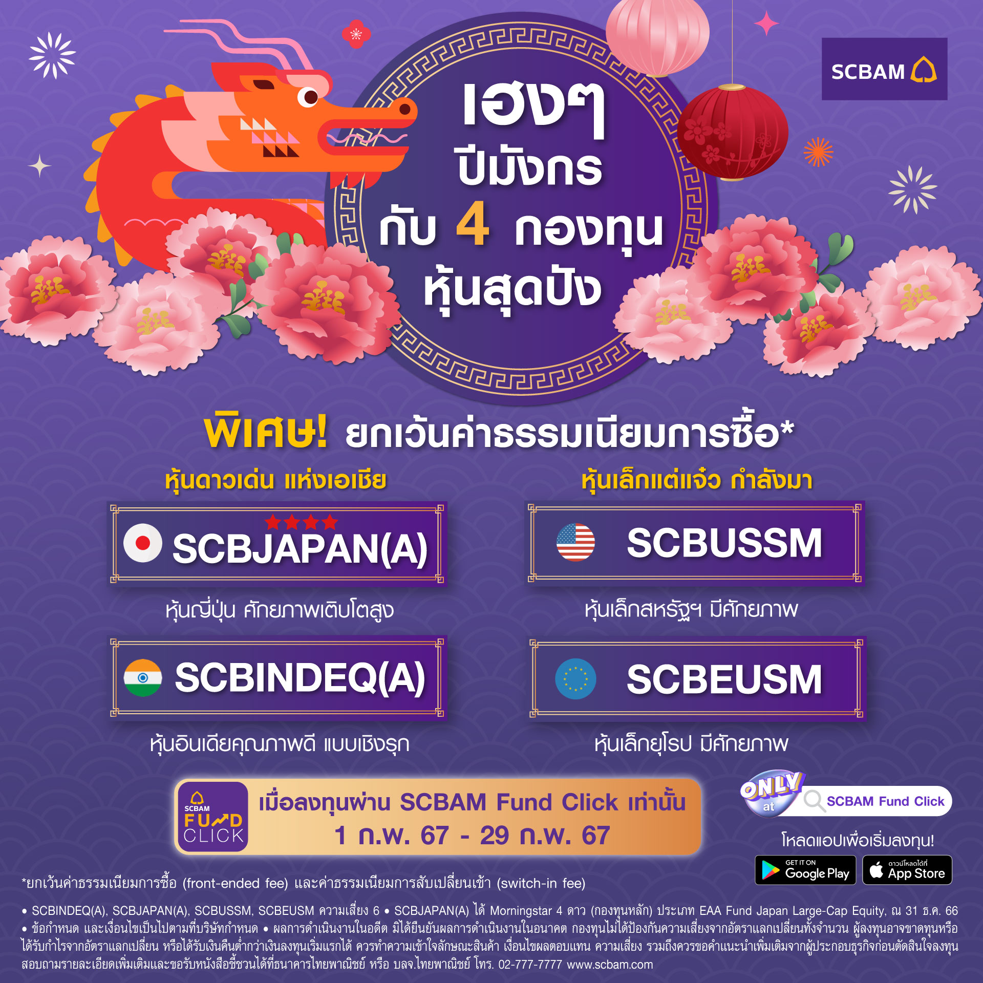 บลจ. ไทยพาณิชย์ เปิดโผ 4 กองทุนหุ้นสุดปัง รับโอกาสเฮงปีมังกร ฉลองตรุษจีน ฟรีค่าธรรมเนียม เมื่อลงทุนผ่าน SCBAM FUND CLICK ระหว่างวันที่ 1- 29 ก.พ. 67