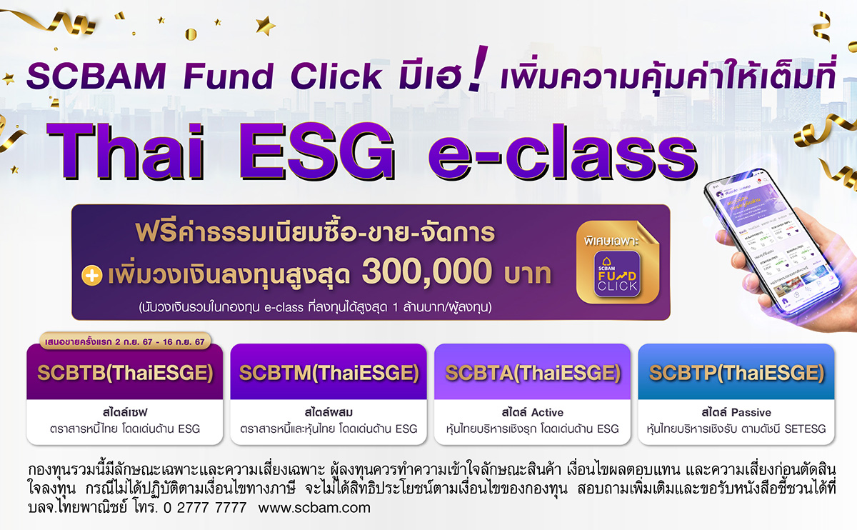 ปัจจุบัน SCBAM มีกองทุน Thai ESG ให้เลือกลงทุนครบ 4 สไตล์ ทั้งกองทุนตราสารหนี้ กองทุนผสม กองทุนหุ้น Active กองทุนหุ้น Passive โดยครั้งนี้ ได้เปิดเพิ่มกองทุนชนิด e-class พร้อมกันทุกสไตล์ ประกอบด้วย (1) กองทุน SCBTB(ThaiESGE) หรือ กองทุนเปิดไทยพาณิชย์ ตราสารหนี้ไทยยั่งยืน (ชนิดไทยเพื่อความยั่งยืนผ่านช่องทางอิเล็กทรอนิกส์) ลงทุนตราสารหนี้ภาครัฐ เสริมด้วยตราสารหนี้เอกชนคุณภาพดี ที่โดดเด่นด้าน ESG เสนอขายครั้งแรกวันที่ 2 ก.ย. 67 – 16 ก.ย. 67 (2) กองทุน SCBTM(ThaiESGE) หรือ กองทุนเปิดไทยพาณิชย์ ไทยผสมยั่งยืน (ชนิดไทยเพื่อความยั่งยืนผ่านช่องทางอิเล็กทรอนิกส์) ลงทุนผสมยืดหยุ่นในตราสารหนี้ และหุ้นของบริษัทที่โดดเด่นด้าน ESG (3) กองทุน SCBTA(ThaiESGE) หรือ กองทุนเปิดไทยพาณิชย์ หุ้นไทยยั่งยืนแอคทีฟ (ชนิดไทยเพื่อความยั่งยืนผ่านช่องทางอิเล็กทรอนิกส์) ลงทุนเชิงรุก คัดหุ้นไทยที่คำนึงปัจจัยด้าน ESG ในการดำเนินธุรกิจและมีมูลค่าน่าสนใจ และสุดท้าย (4) กองทุน SCBTP(ThaiESGE) หรือ กองทุนเปิดไทยพาณิชย์ หุ้นไทยยั่งยืนพาสซีฟ (ชนิดไทยเพื่อความยั่งยืนผ่านช่องทางอิเล็กทรอนิกส์) ลงทุนด้วยกลยุทธ์แบบ Optimization มุ่งสร้างผลตอบแทนใกล้เคียงดัชนี SETESG TRI
