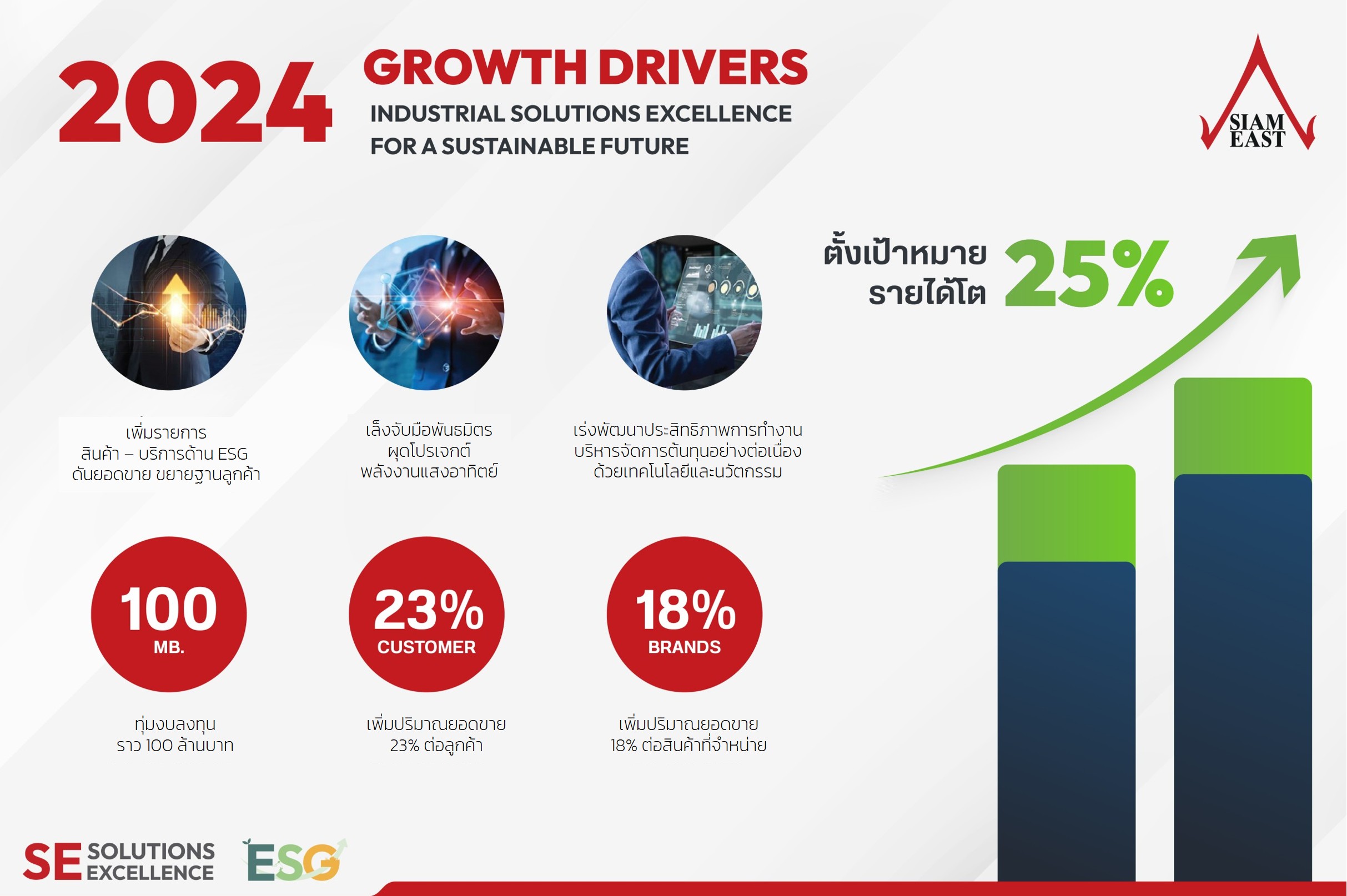 นายเกริก ลีเกษม รองประธานเจ้าหน้าที่บริหาร บริษัท สยามอีสต์ โซลูชั่น จำกัด (มหาชน) หรือ SE เปิดเผย ว่า ทิศทางธุรกิจปี 2567 บริษัทยังคงมุ่งมั่นยกระดับงานบริการ (Solutions Excellence) ตอบสนองความต้องการแก่ลูกค้ากลุ่มอุตสาหกรรม โดยตั้งเป้าหมายรายได้เติบโต 25%