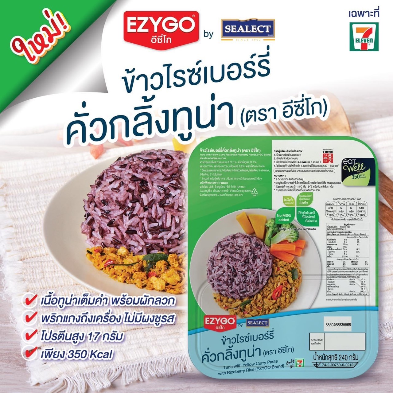 เตรียมตัวแซ่บให้ฟินเฟร่อไปกับแบรนด์ ซีเล็ค (SEALECT) ภายใต้บริษัท ไทยยูเนี่ยน กรุ๊ป จำกัด (มหาชน) ผู้ผลิตอาหารทะเลระดับโลก จับมืออีซี่โก (Ezygo) ผู้นำด้านผลิตภัณฑ์อาหารพร้อมรับประทาน ปูพรมกระจายความอร่อยทั่วประเทศผ่าน 7-Eleven กับเมนูใหม่แกะกล่อง “ทูน่าคั่วกลิ้งข้าวไรซ์เบอร์รี่” ที่การันตีความอร่อยแซ่บพริกแกงถึงเครื่อง เนื้อทูน่าเต็มคำ สารอาหารครบครัน ปราศจากผงชูรส ตอบโจทย์คนรักสุขภาพให้อร่อยได้ง่าย ๆ แบบสุขภาพดี มีโปรตีนสูง 17 กรัม เพียง 350 แคลลอรี่