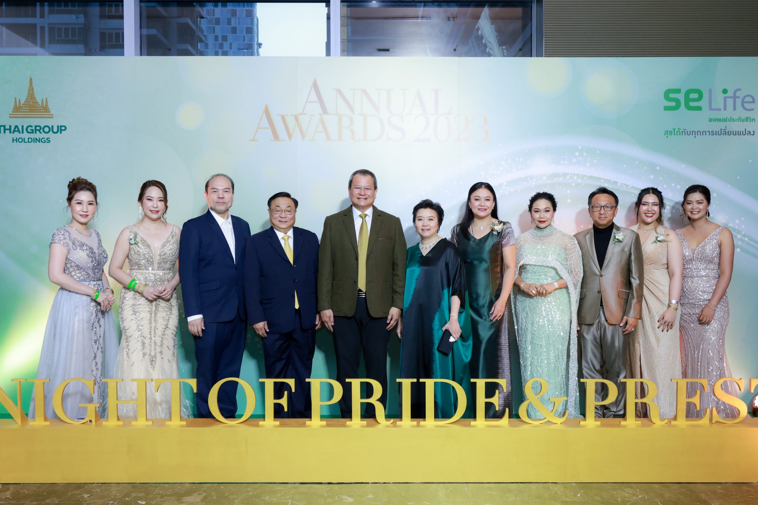 นายโชติพัฒน์ พีชานนท์ ประธานกรรมการบริหาร (คนที่ 5 จากซ้าย) นางอาทินันท์ พีชานนท์ รองประธานกรรมการบริหาร (คนกลาง) ดร.อภิชัย บุญธีรวร กรรมการบริหาร บริษัท ไทยกรุ๊ป โฮลดิ้งส์ จำกัด (มหาชน) (คนที่ 4 จากซ้าย) และ นางภฤตยา สัจจศิลา กรรมการผู้จัดการ บริษัท อาคเนย์ประกันชีวิต จำกัด (มหาชน) (คนที่ 5 จากขวา) จัดงาน Annual Awards 2023 ภายใต้คอนเซ็ปต์ “The Night of Pride & Prestige” ร่วมฉลองความสำเร็จ พร้อมมอบรางวัลเกียรติยศแห่งความภาคภูมิใจให้แก่สุดยอดผู้บริหารและตัวแทนผู้พิชิตคุณวุฒิของ SE Life อาคเนย์ประกันชีวิต ที่ทำยอดขายสูงสุดประจำปี 2566 ณ โรงแรม ดิ โอกุระ เพรสทีจ กรุงเทพฯ เมื่อเร็ว ๆ นี้