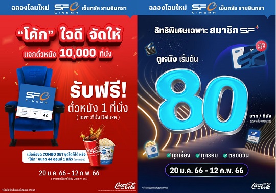 บริษัท เอส เอฟ คอร์ปอเรชั่น จำกัด (มหาชน) ร่วมกับ บริษัท ไทยน้ำทิพย์ คอร์ปอเรชั่น จำกัด เตรียมฉลองปรับโฉมใหม่กับ “โรงภาพยนตร์ เอส เอฟ ซีเนม่า สาขาเซ็นทรัล รามอินทรา” ส่งโปรโมชั่นพิเศษ ให้สิทธิ์ลูกค้า เอส เอฟ และ โค้ก!! เพียงซื้อชุด Combo Set ชุดใดก็ได้ หรือเครื่องดื่ม ขนาด 44 ออนซ์ จำนวน 1 แก้วในราคาปกติ รับบัตรชมภาพยนตร์ที่นั่ง Deluxe ฟรี 1 ที่นั่ง (จำกัดจำนวน 10,000 สิทธิ์เท่านั้น) ตั้งแต่ 20 มกราคม – 12 กุมภาพันธ์ 2566 พร้อมสามารถใช้สิทธิ์ได้ตั้งแต่วันที่ 20 มกราคม – 28 กุมภาพันธ์ 2566” ที่โรงภาพยนตร์ เอส เอฟ ซีเนม่า สาขาเซ็นทรัล รามอินทรา