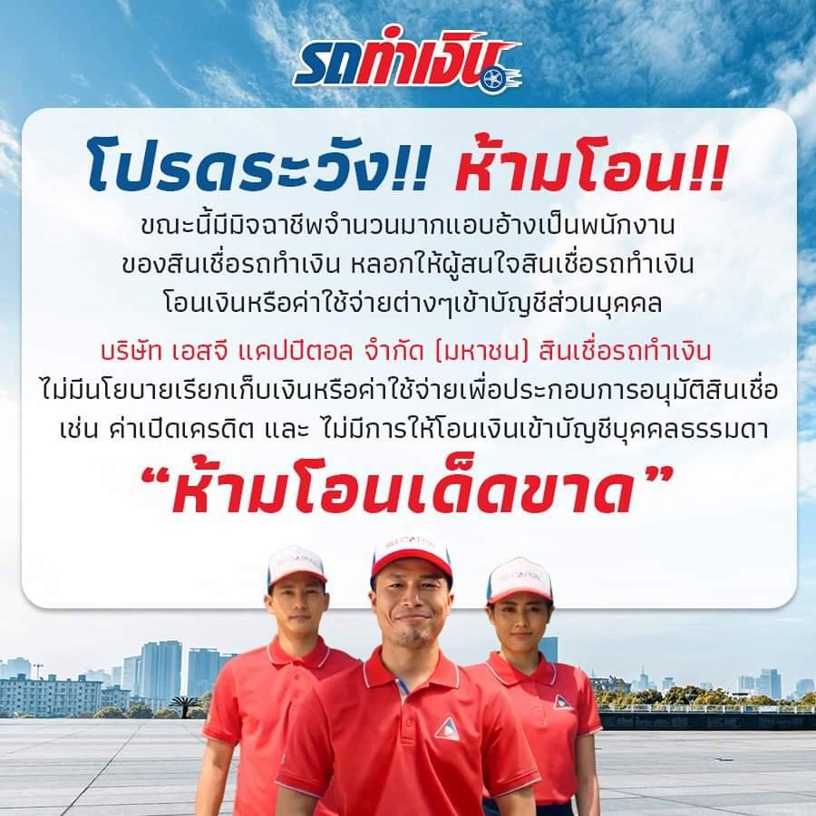 บริษัท เอสจี แคปปิตอล จำกัด (มหาชน) หรือ SGC เตือนภัยระวังอย่าหลงกลลวงมิจฉาชีพแอบอ้างเป็นพนักงานและตัวแทนจากบริษัทฯ ชักชวนสมัครสินเชื่อในนาม SG Capital เรียกเก็บเงินล่วงหน้าผ่านออนไลน์บนเฟสบุ๊ก ไลน์ และเว็บไซต์ปลอม แอบอ้างใช้ชื่อบริษัท เอสจี แคปปิตอลฯ ภาพผู้บริหาร และโลโก้แบรนด์ผลิตภัณฑ์ต่าง ๆ ในกลุ่ม SG Capital เช่น “สินเชื่อรถทำเงิน” โพสต์สร้างความน่าเชื่อถือหลอกลวงเหยื่อ เสนอสิทธิประโยชน์จูงใจ อาทิ อนุมัติไว รับเงินทันที อ้างวงเงินอนุมัติแล้ว เสนอเงื่อนไขให้ลูกค้าโอนเงินเพื่อค่าเปิดเครดิต หรือค่าปลดล็อคเครดิตบูโรโดยใช้บัญชีส่วนบุคคล ย้ำชัด SG Capital ไม่มีนโยบายเรียกเก็บเงินล่วงหน้าทุกกรณีเดินหน้ารวบรวมหลักฐานดำเนินคดีมิจฉาชีพให้ถึงที่สุด