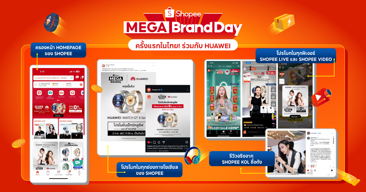 แคมเปญ “Shopee Mega Brand Day x HUAWEI” ถือเป็นการร่วมมือครั้งยิ่งใหญ่ โดย Shopee ได้ให้การสนับสนุนแบบ 360 องศา ครอบคลุมทั้งการสื่อสารในแพลตฟอร์มและนอกแพลตฟอร์ม เพื่อสร้างการมองเห็นสูงสุดให้กับแบรนด์ ตั้งแต่การโปรโมทหน้าแคมเปญหลักบนแอป Shopee  การสื่อสารผ่านสื่อดิจิทัลและโซเชียลมีเดีย ตลอดจนการทำโฆษณาภายนอกแพลตฟอร์ม เพื่อขยายการเข้าถึงกลุ่มผู้บริโภคในวงกว้าง