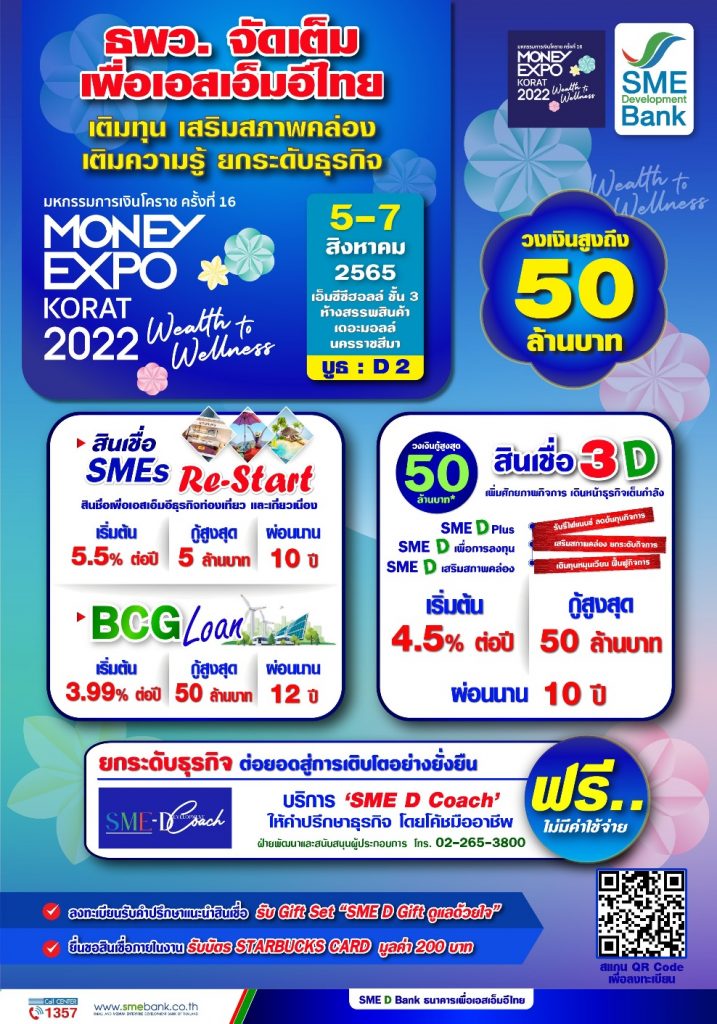 ธนาคารพัฒนาวิสาหกิจขนาดกลางและขนาดย่อมแห่งประเทศไทย (ธพว.) หรือ SME D Bank ยกขบวน “เติมทุนคู่พัฒนา” จัดเต็มเพื่อเอสเอ็มอีไทย เข้าร่วมในงาน “มหกรรมการเงินโคราช ครั้งที่ 16 (Money Expo Korat 2022)” ระหว่างวันที่ 5-7 สิงหาคม 2565 ณ เอ็มซีซี ฮอลล์ ชั้น 3 ห้างสรรพสินค้าเดอะมอลล์นครราชสีมา หมายเลขบูธ D 2 พบกับสินเชื่อเสริมสภาพคล่องครอบคลุมทุกกลุ่มธุรกิจ เช่น “แพ็กเกจสินเชื่อ 3D” ดอกเบี้ยเริ่มต้น 4.5% ต่อปี วงเงินกู้สูงสุด 50 ล้านบาท ผ่อนนานสูงสุด 10 ปี, “สินเชื่อ SMEs Re-Start” สนับสนุนธุรกิจเอสเอ็มอีธุรกิจท่องเที่ยวและเกี่ยวเนื่อง ดอกเบี้ยเริ่มต้น 5.5 % ต่อปี วงเงินกู้สูงสุด 5 ล้านบาท ผ่อนนานสูงสุด 10 ปี ปลอดชำระเงินต้นสูงสุด 24 เดือน และ “สินเชื่อ BCG Loan” ดอกเบี้ยเริ่มต้นเพียง 3.99% ต่อปี วงเงินกู้สูงสุด 50 ล้านบาท ผ่อนนานสูงสุด 12 ปี ปลอดชำระเงินต้นสูงสุด 24 เดือน