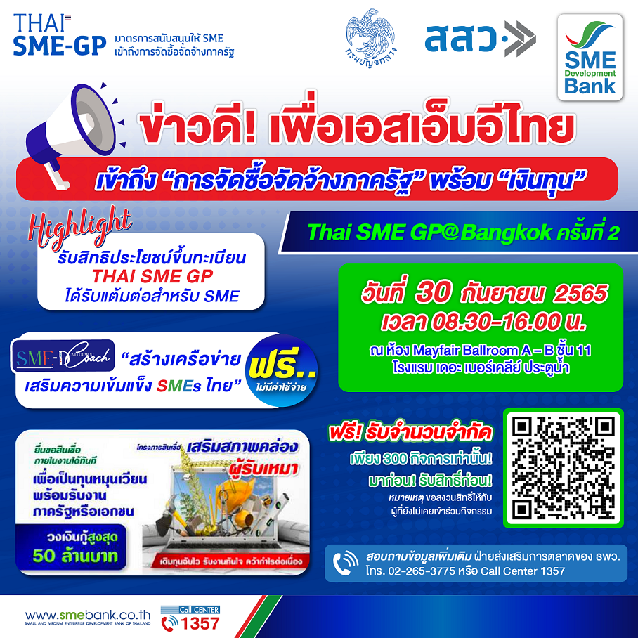 ธนาคารพัฒนาวิสาหกิจขนาดกลางและขนาดย่อมแห่งประเทศไทย (ธพว.) หรือ SME D Bank ร่วมกับ สำนักงานส่งเสริมวิสาหกิจขนาดกลางและขนาดย่อม (สสว.) จัดงาน “Thai SME GP@Bangkok” ครั้งที่ 2 ในวันที่ 30 กันยายน 2565 เวลา 08.30-16.00 น. ณ ห้อง Mayfair Ballroom A – B ชั้น 11 โรงแรม เดอะ เบอร์เคลีย์ ประตูน้ำ เพื่อสนับสนุนผู้ประกอบการเอสเอ็มอีไทย เข้าถึงตลาดจัดซื้อจัดจ้างภาครัฐที่มีมูลค่ากว่า 1.3 ล้านล้านบาทต่อปี พิเศษ! ผู้ประกอบการเอสเอ็มอีที่เข้าร่วมงาน จะได้สิทธิประโยชน์จากการขึ้นทะเบียน THAI SME-GP เช่น ได้รับแต้มต่อ 10% กรณีจัดซื้อจัดจ้างโดยใช้เกณฑ์ราคาพิจารณา และแต้มต่อ 15% กรณีจัดซื้อจัดจ้างโดยใช้เกณฑ์ราคาพิจารณา ได้รับพิจารณาเป็นลำดับแรกกรณีจัดซื้อจัดซื้อจัดจ้างวงเงินไม่เกิน 500,000 บาท เป็นต้น